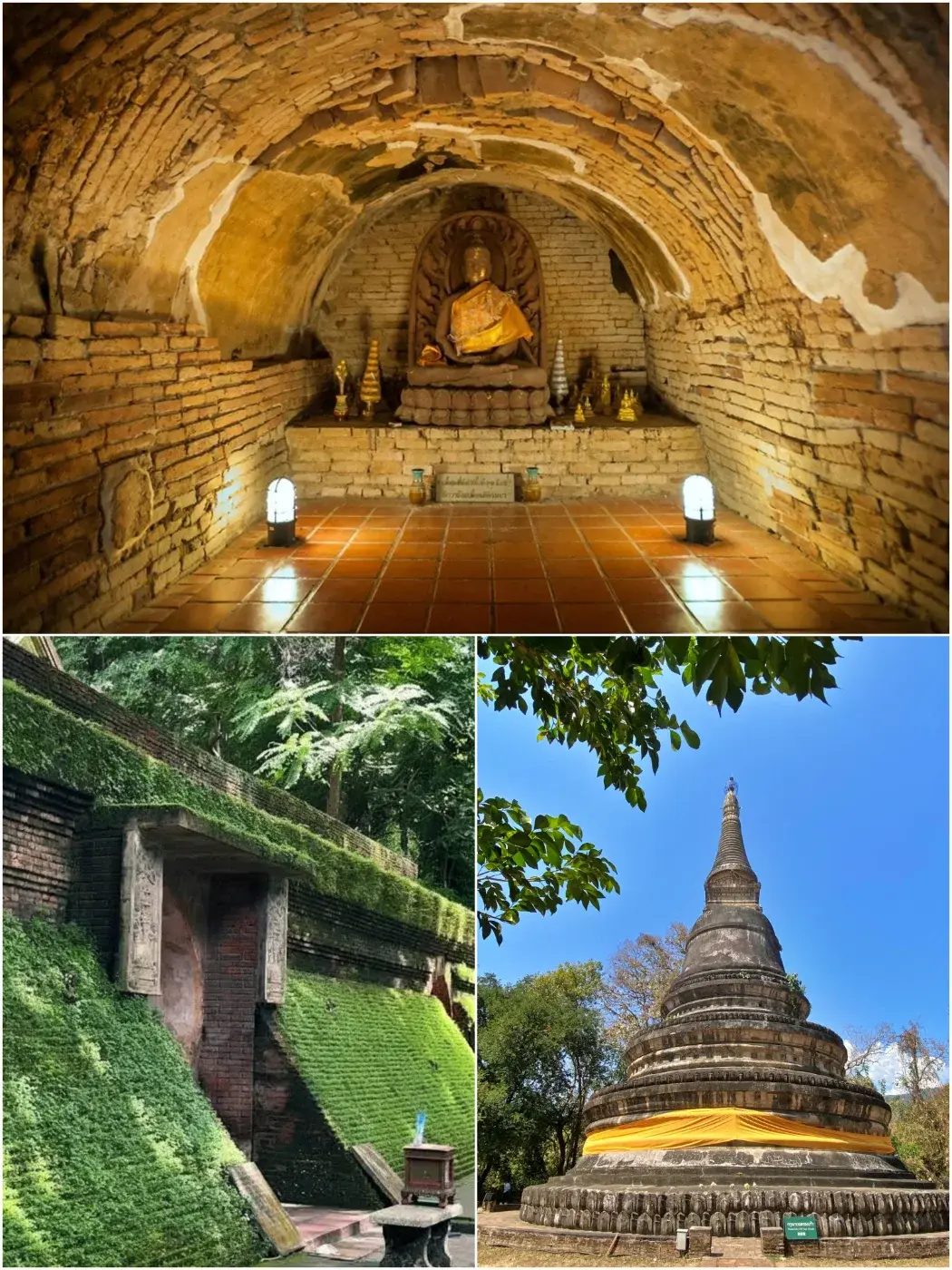 หัวใจสำคัญของวัดคืออุโมงค์เก่าแก่ที่เรียกว่า “อุโมงค์เถรจันทร์” สร้างขึ้นในสมัยพญากือนา ประมาณปี พ.ศ. 1918 เพื่อถวายแด่พระมหาเถระจันทร์ พระภิกษุผู้รักความสันโดษและการปฏิบัติธรรมในป่า ภายในอุโมงค์มีทางเดินคดเคี้ยวเชื่อมถึงกันสี่ทิศ ผนังอิฐโค้งงามตามแบบศิลปะล้านนา และยังคงเหลือร่องรอยของภาพจิตรกรรมฝาผนังโบราณ ซึ่งนักวิชาการเชื่อว่าเป็นหนึ่งในจิตรกรรมที่เก่าแก่ที่สุดในภาคเหนือ ทุกครั้งที่เดินผ่านความเย็นชื้นภายในอุโมงค์ ผู้มาเยือนมักสัมผัสได้ถึงความสงบลึกซึ้งที่ยากจะอธิบาย เป็นความเงียบที่ไม่ได้ว่างเปล่า แต่เต็มไปด้วยพลังแห่งสมาธิและความศรัทธา