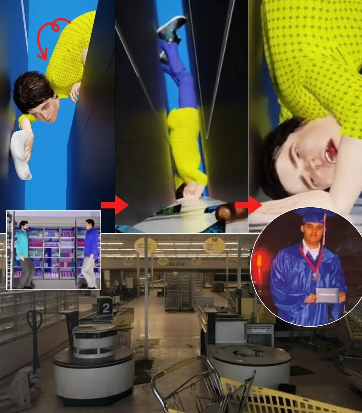 แต่ด้วยความสับสนและมึนงงจากอาการป่วย เขาจึง “พลัดตกลงไปในช่องว่างแคบ ๆ” ด้านหลังตู้แช่ ที่สูงถึง 12 ฟุต ศีรษะดิ่งลงด้านล่าง ร่างติดแน่น จนไม่สามารถขยับตัวหรือปีนกลับขึ้นมาได้