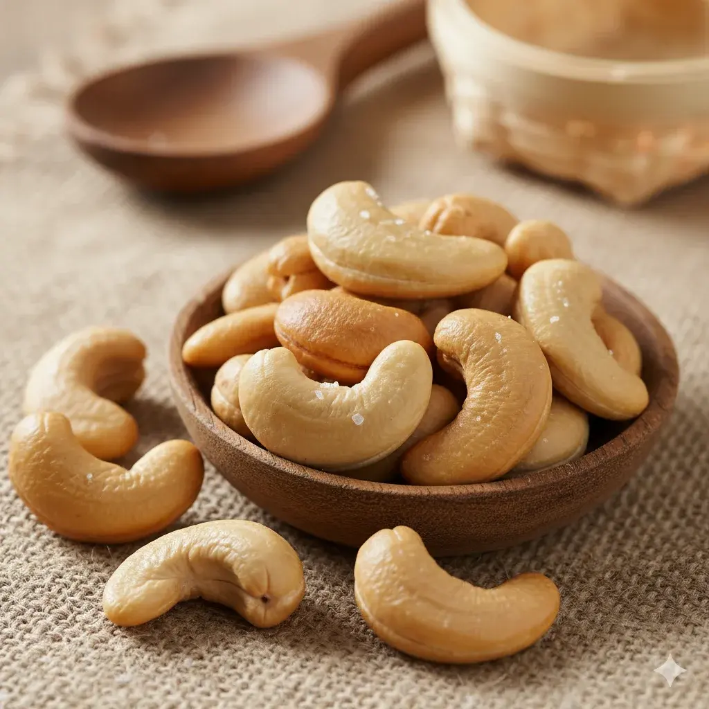 เม็ดมะม่วงหิมพานต์ถือเป็นของว่างชั้นดีที่ธรรมชาติมอบให้ เต็มไปด้วยไขมันดีประเภทไม่อิ่มตัวเชิงเดี่ยว โปรตีน วิตามิน K และ B6 รวมถึงแร่ธาตุสำคัญอย่างทองแดง แมกนีเซียม และฟอสฟอรัส มันมีรสชาติหอมมัน กรอบ และมักถูกนำไปคั่ว อบ หรือบดทำเนยถั่ว เพื่อใช้เป็นส่วนผสมในอาหารและขนมหลากหลายชนิด นอกจากรสชาติที่อร่อยละมุนแล้ว มันยังเป็นอาหารที่มีคุณค่าทางโภชนาการสูง สามารถช่วยบำรุงหัวใจและหลอดเลือดได้เป็นอย่างดี ด้วยคุณสมบัติของไขมันดีที่ช่วยลดระดับไขมันเลวในเลือด อีกทั้งยังช่วยบำรุงกระดูกและฟันให้แข็งแรงจากแร่ธาตุที่อุดมสมบูรณ์