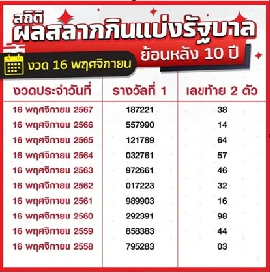 เผยสถิติการออกสลากกินแบ่งรัฐบาล ย้อนหลัง 10 ปี..งวดวันที่ 16 พฤศจิกายน 68 เหลือเวลาอีกอาทิตย์นิดๆ ก็ถึงวันแห่งความหวัง เชื่อว่าหลายคนอาจจะยังไม่มีสลากกินแบ่งรัฐบาล วันนี้เราเลยรวบรวมเอาข้อมูลหวยตลอด 10 ปีที่ผ่านมาว่าในวันที่ 16 พฤศจิกายน นั้นหวยจะออกเลขอะไรกันบ้าง ทั้งนี้เพื่อใช้เป็นแนวทางในการเสี่ยงโชคหวยในงวดนี้ มีหลายคนที่เคยซื้อตามแล้วถูกหวยก็ยังมี สถิติดีๆ แบบนี้เสียดายแย่ถ้าไม่ลองซื้อตาม