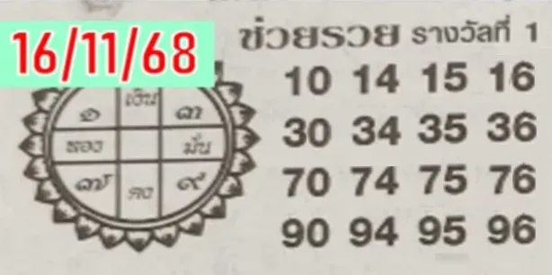 สำหรับเลขเด็ด "โหราพารวย" ก็สามารถสรุปเป็นเลขเด็ดในงวดวันที่ 16 พฤศจิกายน 68 ได้ดังนี้คือ เลขท้าย 2 ตัว ได้แก่ 10, 14, 15, 16, 30, 34, 35, 36, 70, 74, 75, 76, 90, 94, 95, 96