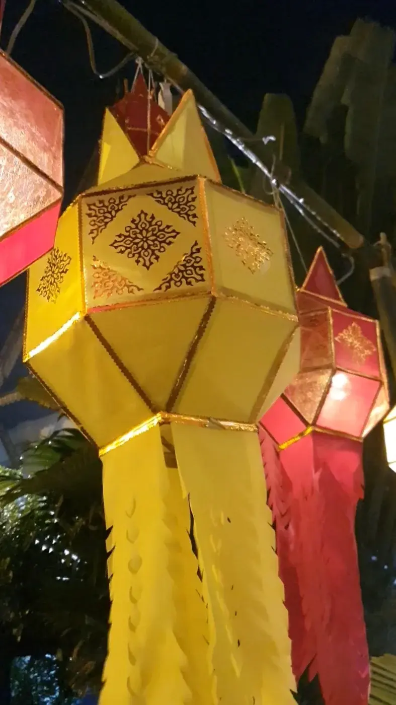 โคมที่ปรากฏในภาพนี้คือ "โคมล้านนา" (หรือที่รู้จักกันในชื่อ "โคมยี่เป็ง") ซึ่งเป็นมากกว่าเพียงแค่เครื่องให้แสงสว่าง แต่เป็นสัญลักษณ์ทางวัฒนธรรมและศรัทธาของชาวล้านนาในภาคเหนือของประเทศไทย โคมล้านนาเป็นงานหัตถกรรมพื้นบ้านที่สืบทอดภูมิปัญญาจากบรรพบุรุษมาอย่างยาวนาน สะท้อนให้เห็นถึงความผูกพันของชาวล้านนากับพระพุทธศาสนาและประเพณีที่งดงาม