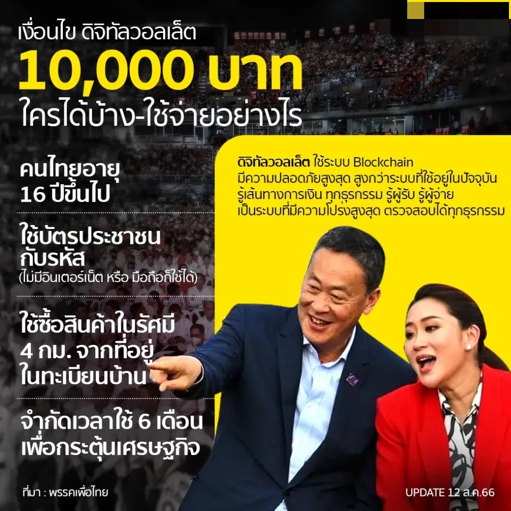 สมัยรัฐบาลฯ แพทองธาร ชินวัตร มีนโยบายหาเสียงแจกฟรี "เงินดิจิตอล 10,000 บาท" มุ่งเน้นอัดฉีดเงินจากรัฐบาลเข้าระบบเศรษฐกิจ ตั้งวงเงินงบประมาณไว้ 600,000 ล้านบาท แต่เนื่องจากเป็นงบประมาณที่สูงมาก และไม่สามารถใช้เงินดิจิตอลได้จริง จึงต้องแจกเป็นเงินสดแจกเฟสแรกให้กลุ่มเปราะบาง (คนจน,คนพิการ) จำนวนเงิน 144,000 ล้านบาท และเฟส 2 กลุ่มผู้สูงอายุ 30,000 ล้านบาท รวมทั้ง 2 เฟสใช้งบฯ ทั้งสิ้น 174,000 ล้านบาท ในระยะเวลาเพียง 6 เดือน รวมผู้ได้รับสิทธิ์ทั้ง 2 เฟส 17.5 ล้านคน (คิดเป็น 26.5% ของประชากรไทย) งบประมาณเฉลี่ย 10,000 บาท/คน