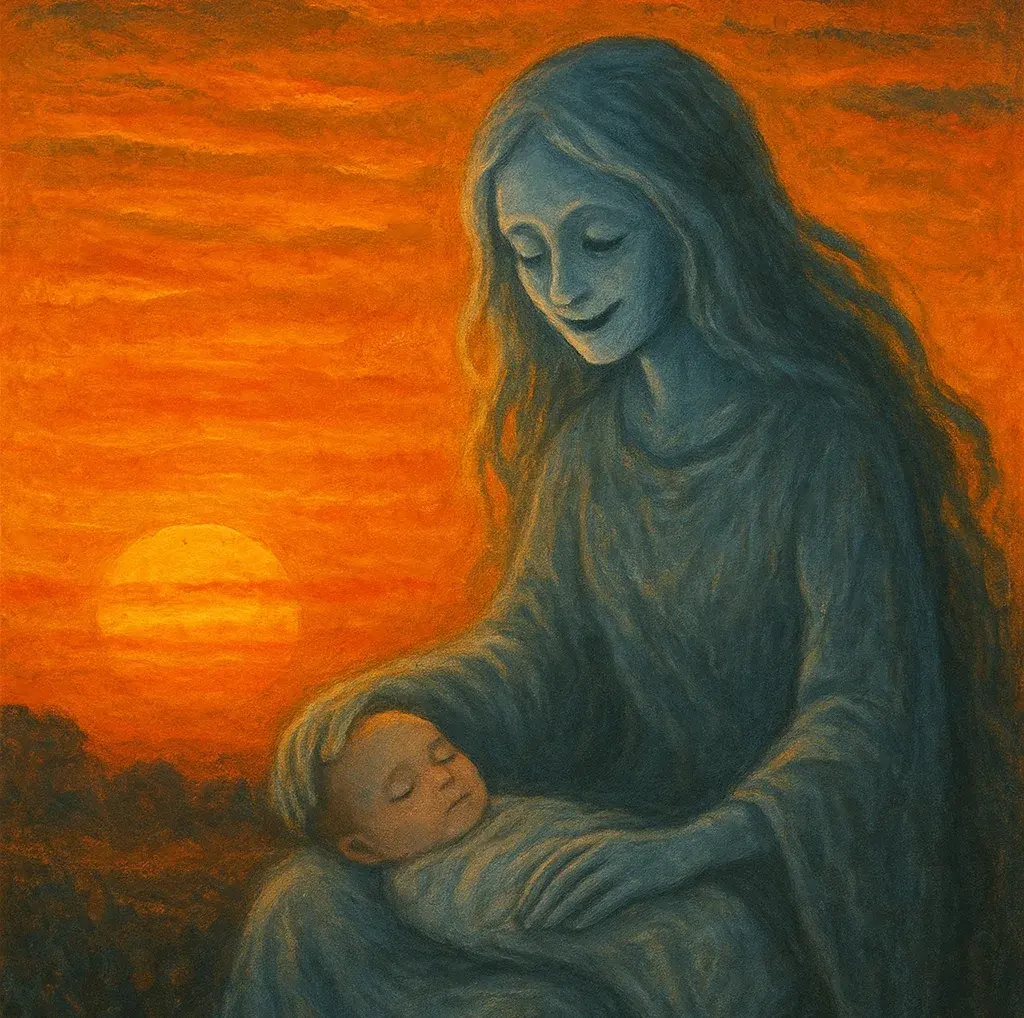 เมื่อท้องฟ้าช่วงเวลาใกล้พระอาทิตย์ตกดิน ราวเวลา 16.00–18.00 น. เริ่มเปลี่ยนสีจากฟ้าใสเป็นส้มอมแดงหรือสีอมส้มเหลือง แสงแดดสุดท้ายของวันทอดผ่านหมู่เมฆและสาดลงบนพื้นดินอย่างอ่อนโยน คล้ายกับการนำผ้าอ้อมเด็กไปตากภายใต้แสงแดดอุ่น ๆ ภาพที่เกิดขึ้นชวนให้รู้สึกอบอุ่นแต่แฝงด้วยความสงัดของช่วงเย็น คนโบราณจึงเปรียบว่าเป็นเวลาที่ “ผีออกมาตากผ้าอ้อมลูก” คำเปรียบเปรยที่ฟังดูแปลกแต่เต็มไปด้วยความหมาย ทั้งในเชิงจิตวิญญาณและในมิติของภูมิปัญญาชีวิต