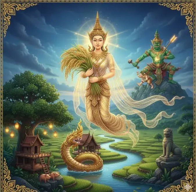 แม่โพสพ เทพธิดาแห่งรวงข้าว: ความเชื่อเรื่องแม่โพสพเป็นที่นับถืออย่างชัดเจนในภาคกลางซึ่งเป็นอู่ข้าวอู่น้ำ ชาวนาเชื่อว่าเมล็ดข้าวทุกเม็ดคือองค์แม่โพสพเอง จึงปฏิบัติต่อรวงข้าวด้วยความเคารพผ่านพิธีกรรมในทุกขั้นตอนของการทำนา: