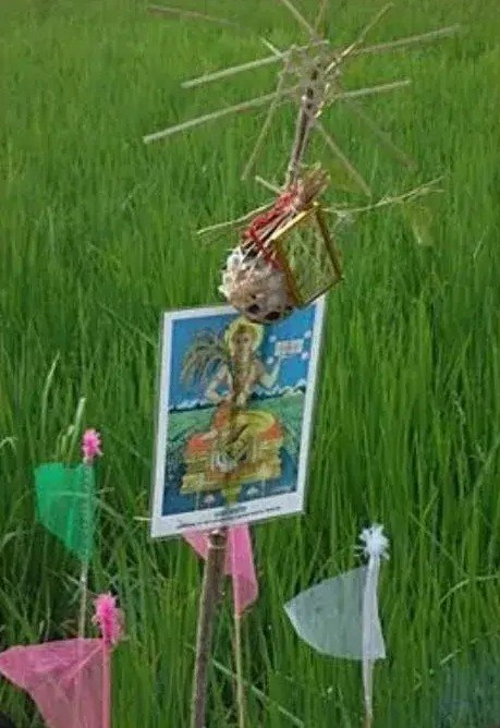 หลังเก็บเกี่ยว: มีพิธี ทำขวัญข้าว บนยุ้งฉาง โดยกล่าวคำขอโทษต่อแม่โพสพที่ได้ล่วงเกินตั้งแต่การหว่านไถ ไปจนถึงการหาบหาม และอุทิศส่วนกุศลให้กับทุกสรรพสัตว์ที่อาจถูกทำร้ายในระหว่างการทำนา