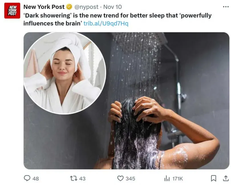Fox News Digital รายงานว่าเทรนด์สุขภาพแบบใหม่ของการอาบน้ำแบบมืดกำลังแพร่กระจายอย่างรวดเร็วบนโซเชียลมีเดีย พิธีกรรมนี้สนับสนุนการอาบน้ำในที่แสงน้อยหรือมืด เพื่อกระตุ้นกลไกการผ่อนคลายของร่างกาย ซึ่งมีประสิทธิภาพอย่างยิ่งต่อผู้ที่มีอาการวิตกกังวล นอนไม่หลับ หรือสมาธิสั้น