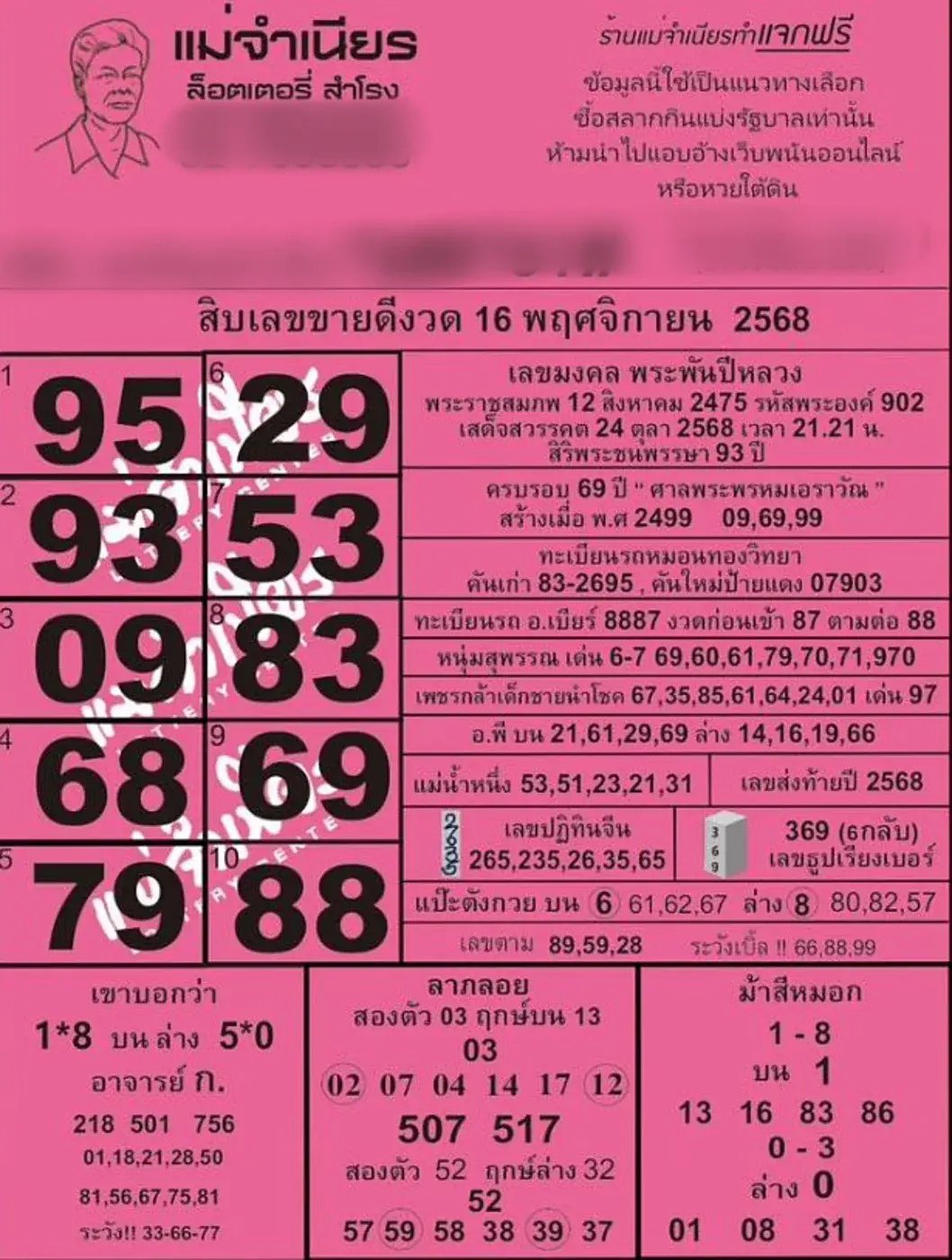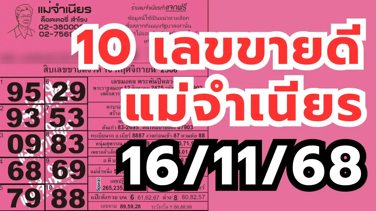 สิบเลขขายดีแม่จำเนียร งวด 16/11/68