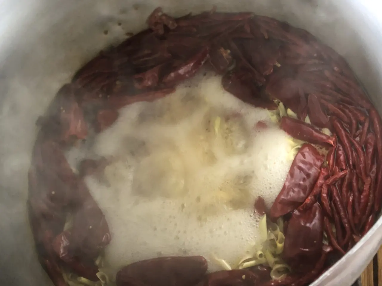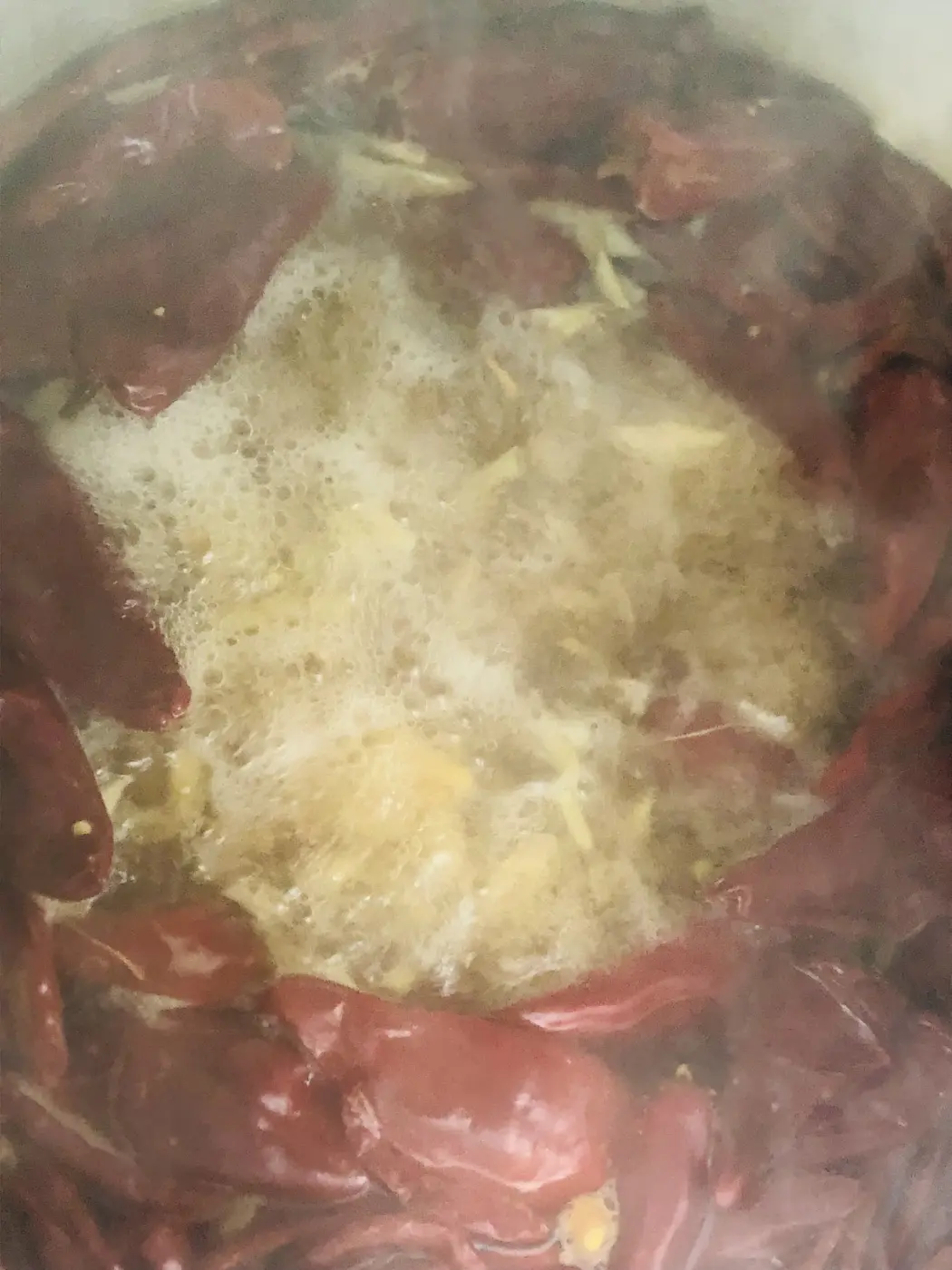 ต่อด้วยพริกใหญ่แห้งแล้วโรยลงไป
