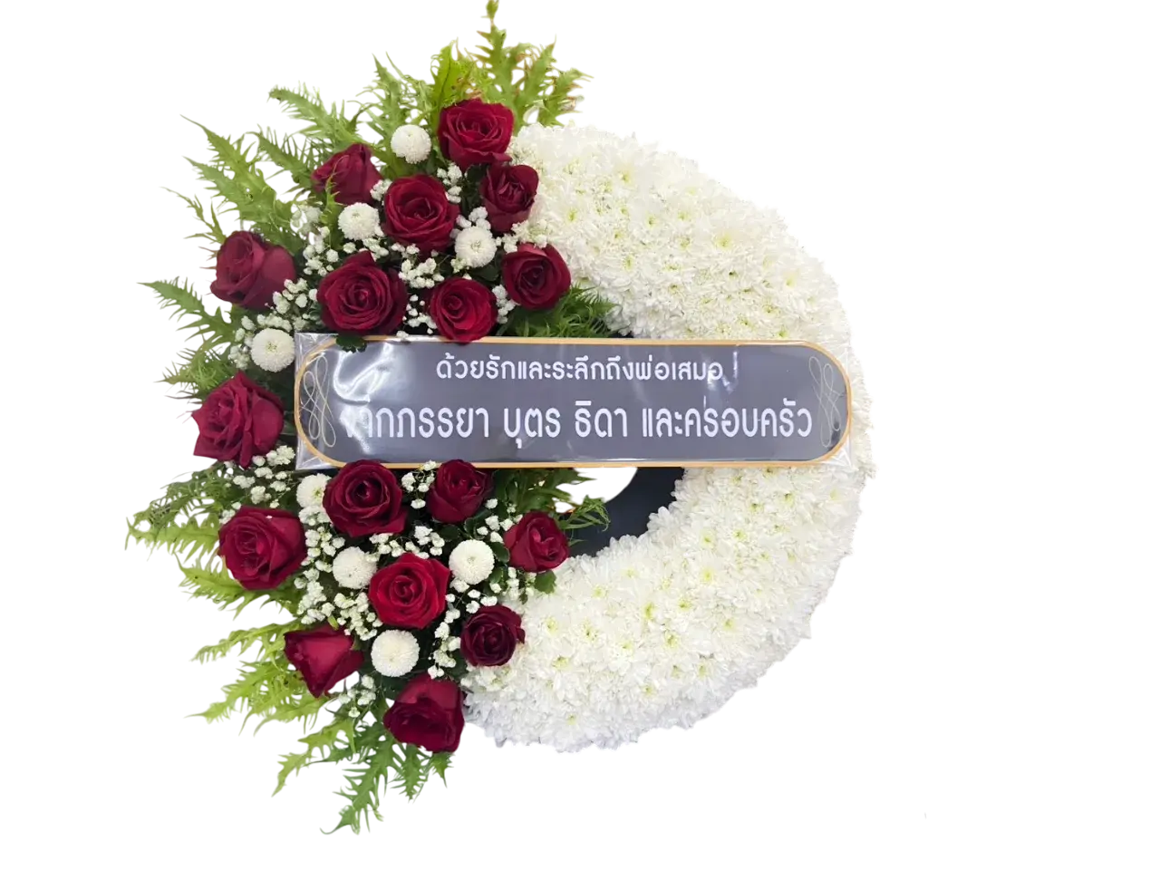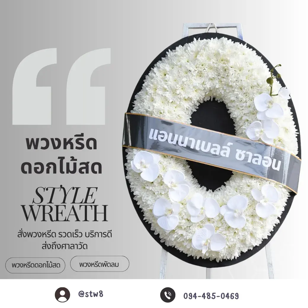 เหมาะกับพวงหรีดดอกไม้สดขนาดกลางถึงใหญ่ โทนสุภาพ เช่น ขาว น้ำเงิน หรือเขียวอ่อน
