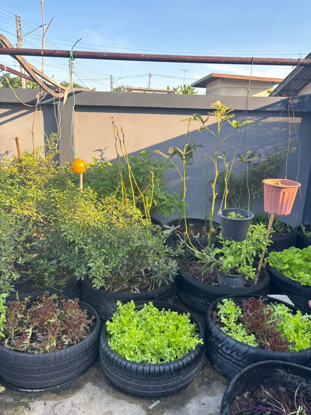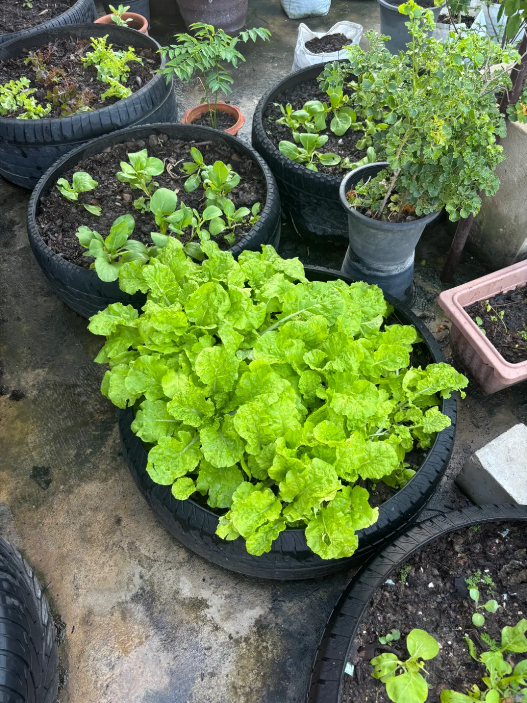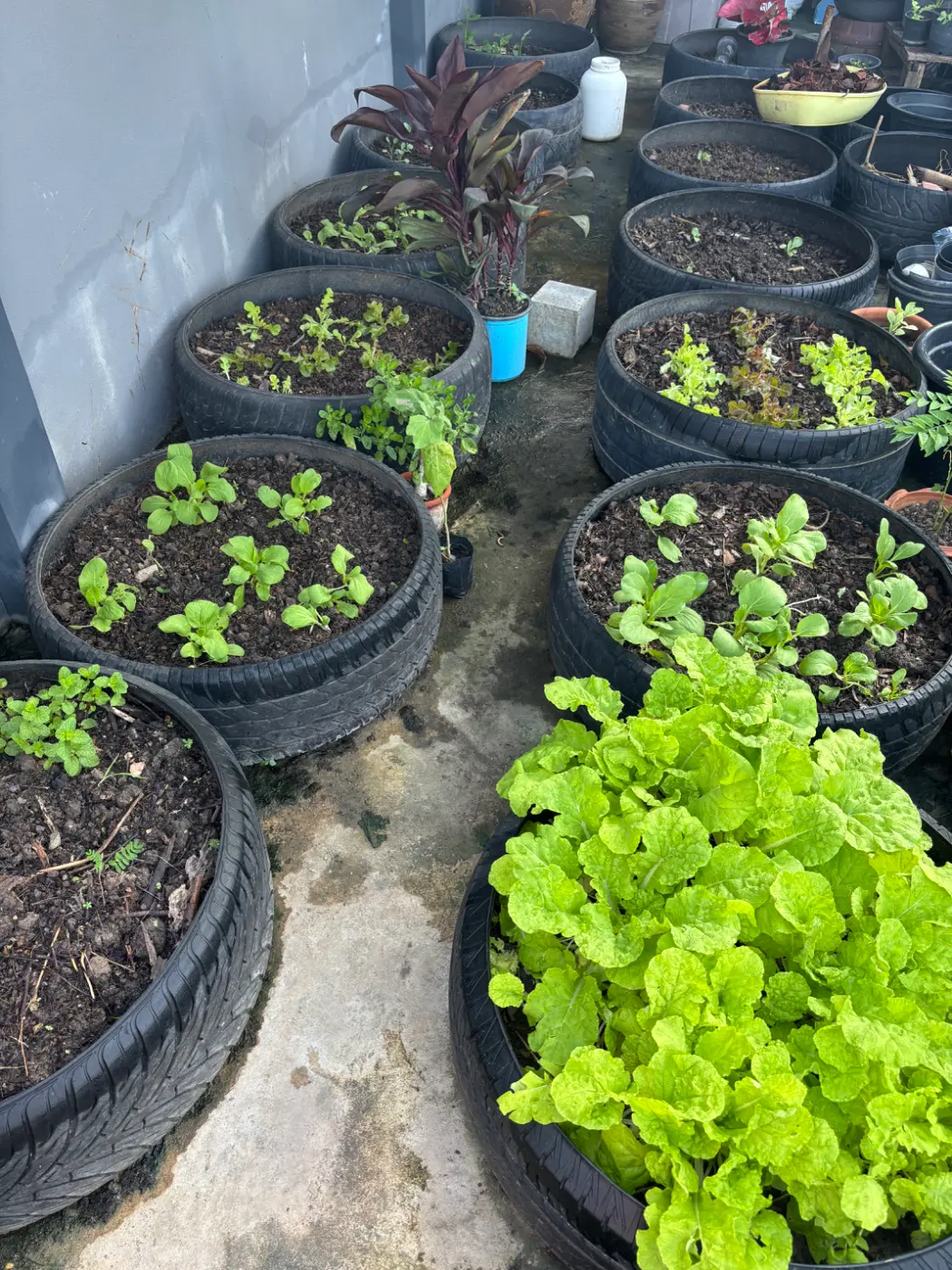 บ้านเราจะใช้ถุงปลูก ยางล้อรถ กระถาง และกะบะปลูกวางเรียงบนพื้นปูน แล้วเติมดินผสมดี ๆ ให้ร่วน ระบายน้ำได้ พอปลูกไปสักพัก ผักต่าง ๆ ก็เริ่มแตกยอด โตไวมาก โดยเฉพาะพวกผักสวนครัวที่กินทุกวัน เช่น พริก กะเพรา โหระพา กระเจี๊ยบเขียว ผักสลัด และผักเคล