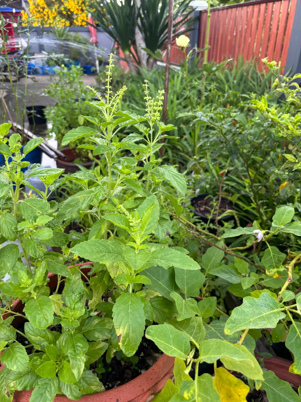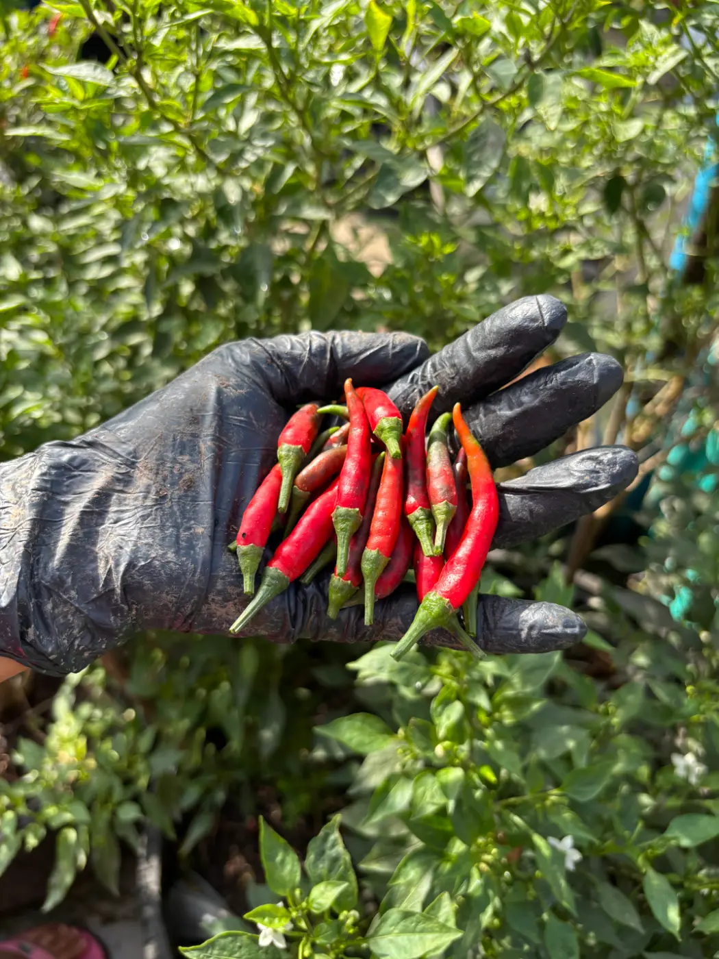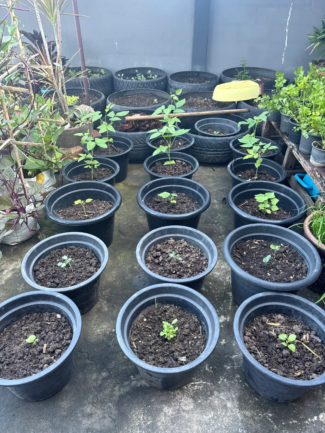 บ้านเราจะใช้ถุงปลูก ยางล้อรถ กระถาง และกะบะปลูกวางเรียงบนพื้นปูน แล้วเติมดินผสมดี ๆ ให้ร่วน ระบายน้ำได้ พอปลูกไปสักพัก ผักต่าง ๆ ก็เริ่มแตกยอด โตไวมาก โดยเฉพาะพวกผักสวนครัวที่กินทุกวัน เช่น พริก กะเพรา โหระพา กระเจี๊ยบเขียว ผักสลัด และผักเคล