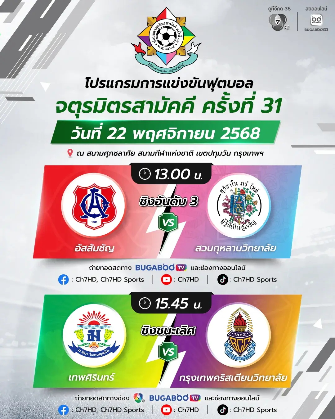 โปรแกรมการแข่งขัน ฟุตบอลจตุรมิตรสามัคคี ครั้งที่ 31 22 พ.ย. นี้