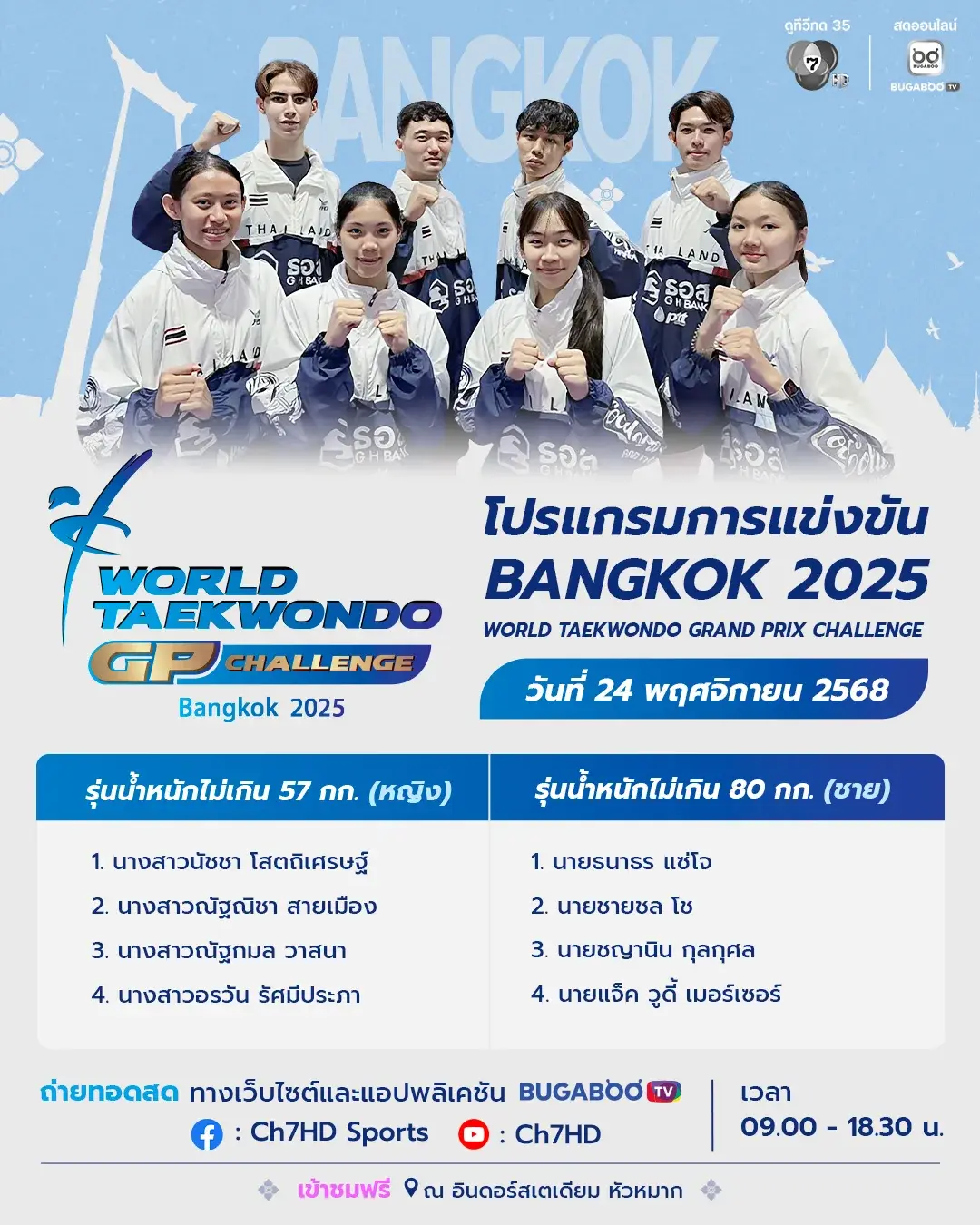 โปรแกรมการแข่งขันเทควันโดในรายการ Bangkok 2025 World Taekwondo Grand Prix Challenge 24 พ.ย.นี้