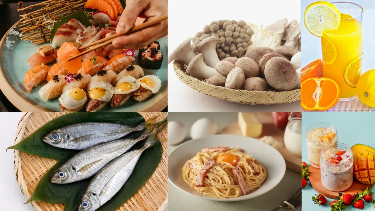 แหล่งวิตามิน D : ปลาแซลมอน ปลาซาร์ดีน ปลาเทราต์ ปลาทูน่า ปลาทู ไข่แดง ตับ นม นมถั่วเหลือง น้ำมันตับปลา เห็ดชิตาเกะ เห็ดแคนทาเรล เห็ดนางรม น้ำส้ม โยเกิร์ต