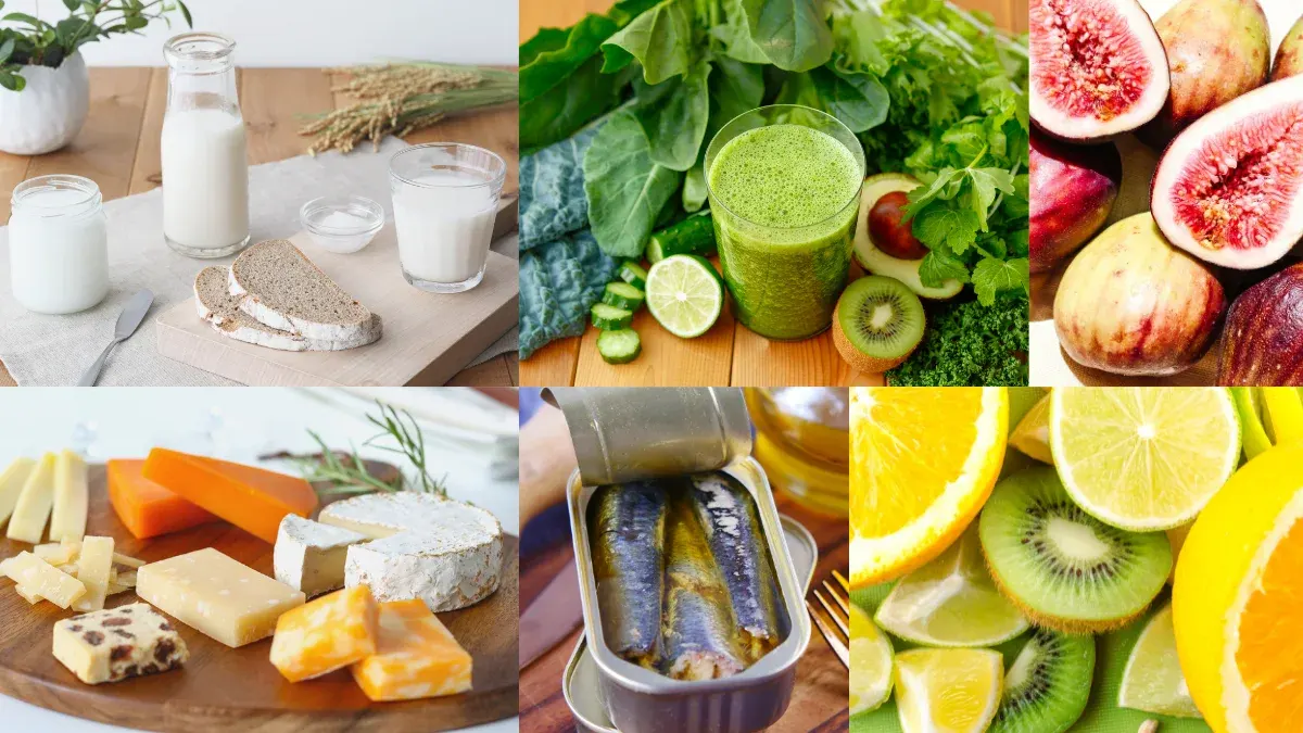แหล่งแคลเซียม : ธัญพืช ผลิตภัณฑ์จากนม โยเกิร์ต ชีส นมถั่วเหลืองที่เสริมแคลเซียม ปลาสลิด บรอกโคลี คะน้า ถั่วต่าง ๆ ปลาซาร์ดีนกระป๋อง ปลาไส้ตัน กุ้งแห้ง หอยนางรม เต้าหู้แข็ง (เนื่องจากเต้าหู้อ่อนอาจมีแคลเซียมต่ำ) งาดำ อัลมอนด์ถั่วบราซิล เมล็ดทานตะวัน ผักคะน้า ผักกาดเขียว ผักกวางตุ้ง มะเดื่อแห้ง กีวี กล้วย ส้ม มะละกอ