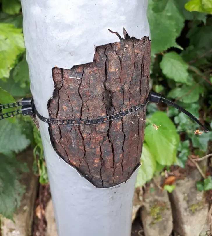 8. สนิมที่ป้ายรถเมล์ตรงนี้ดูเหมือนเปลือกไม้เลย ทำให้ดูเหมือนว่ามีต้นไม้ซ่อนตัวอยู่ด้านใน