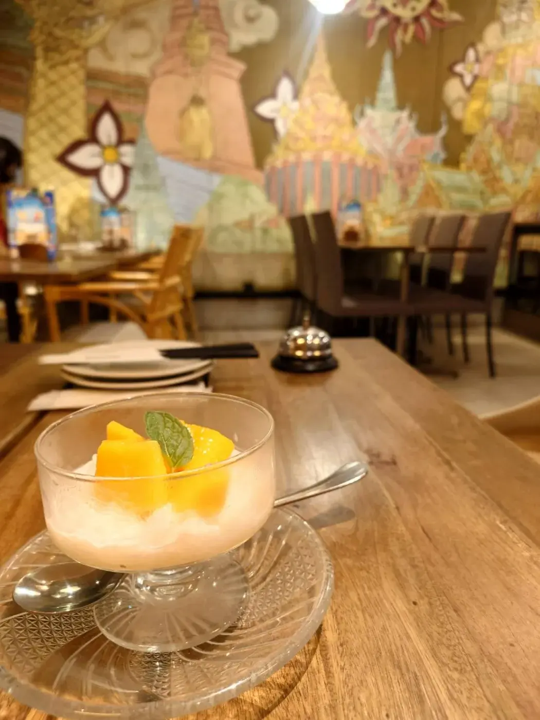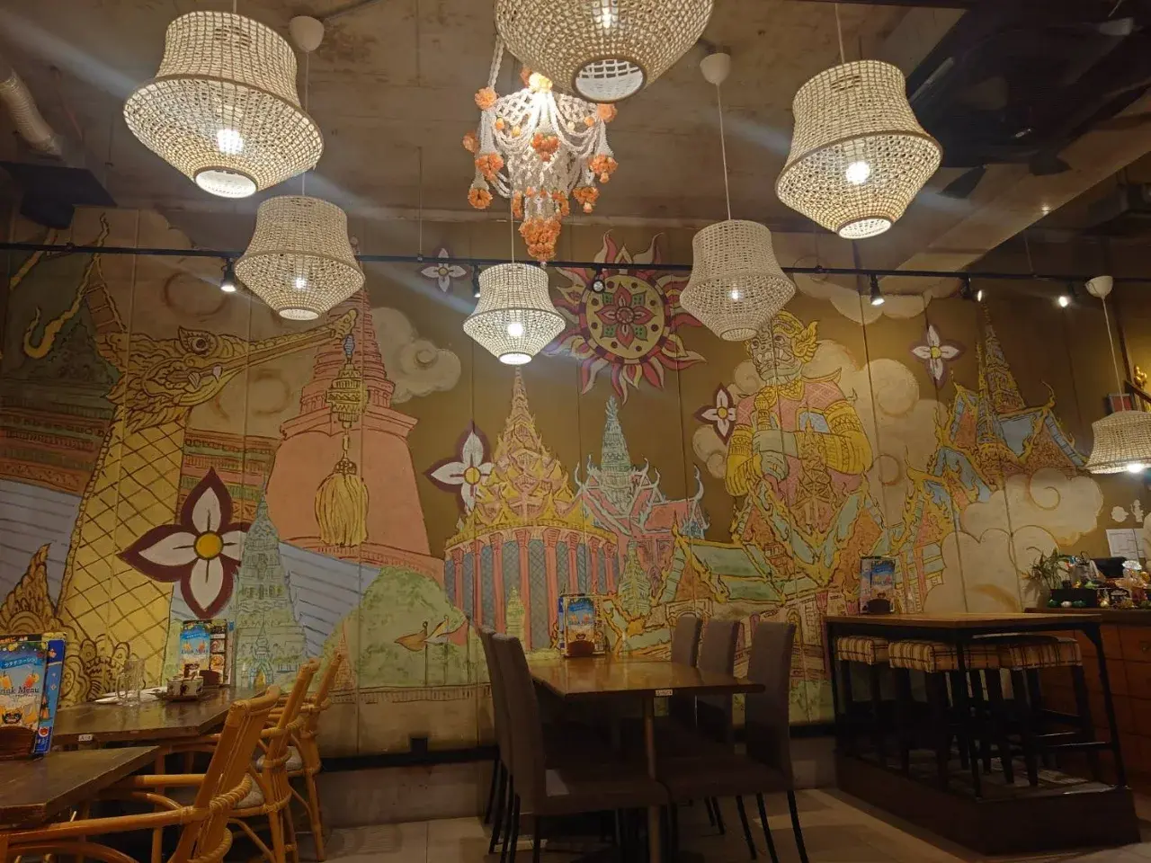 ร้านอาหารแห่งนี้มีภาพวาดที่งดงามบนผนังสไตล์ไทยๆ และตกแต่งอย่างสวยงามในบรรยากาศอบอุ่นเป็นกันเองแบบไทยๆ