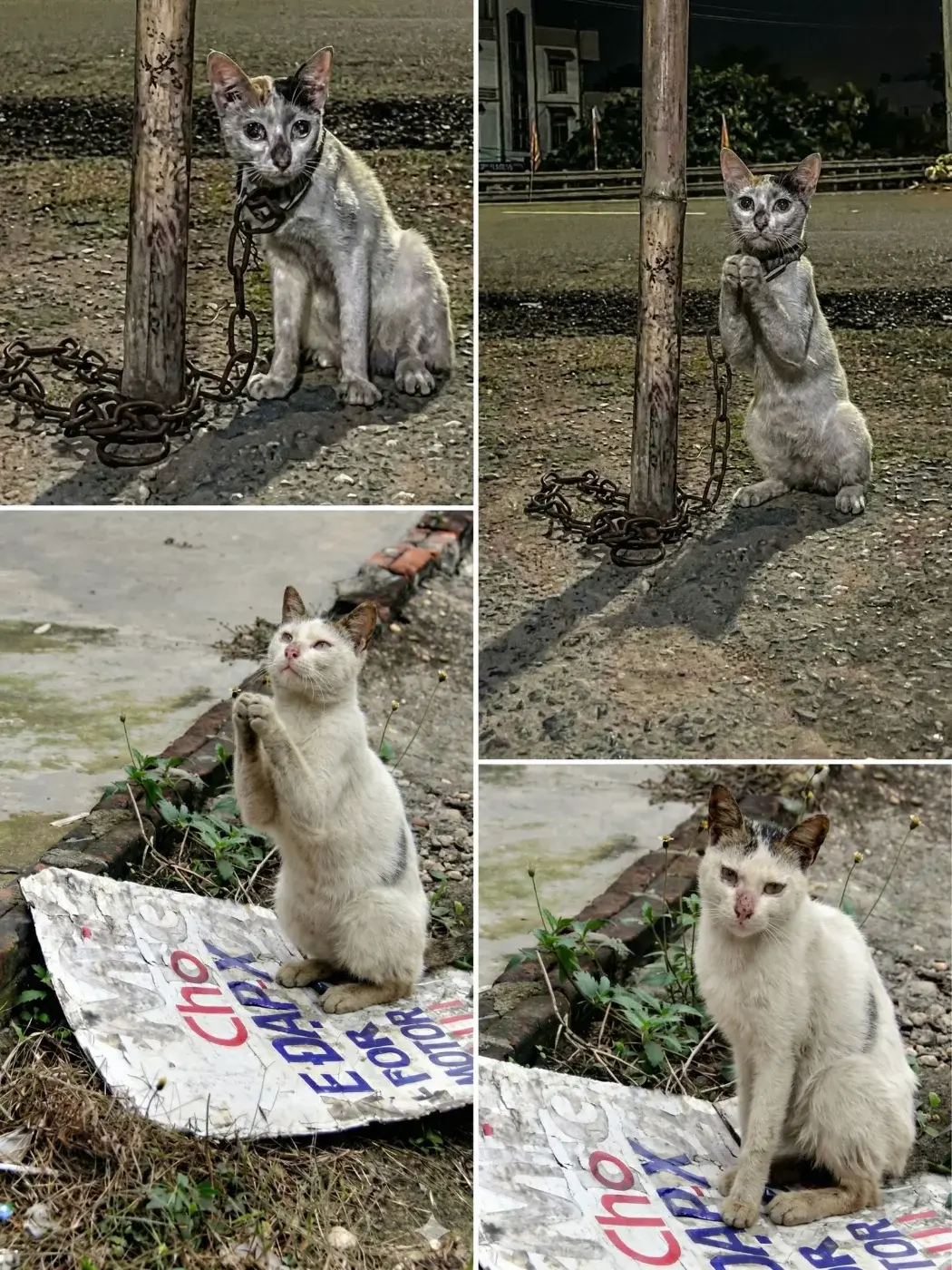 เมื่อชาวบ้านเดินตามเสียงนั้นไป ก็พบลูกแมวตัวน้อยถูกผูกไว้กับเสาไฟ ร่างสั่นระริกท่ามกลางอากาศยามค่ำ ขนพันกันยุ่ง ดวงตากลมใสเต็มไปด้วยความตื่นตกใจ และตัวที่บอบบางเหมือนจะรับความเจ็บปวดมานานแสนนาน