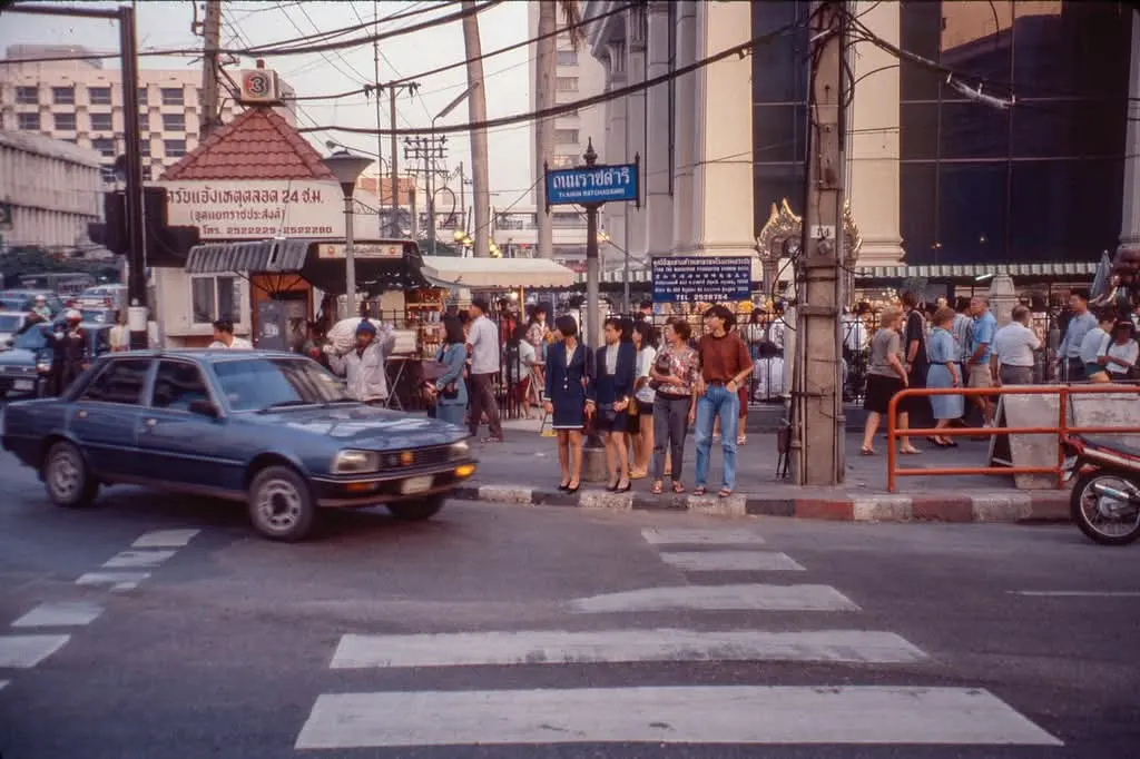 “บรรยากาศสุดคึกคัก! ทางม้าลายหัวถนนราชดำริ ปี 2535 – จุดตัดสำคัญหน้า ‘ท้าวมหาพรหมเอราวัณ’ ที่ผู้คนหลั่งไหลทั้งไทย–เทศ”