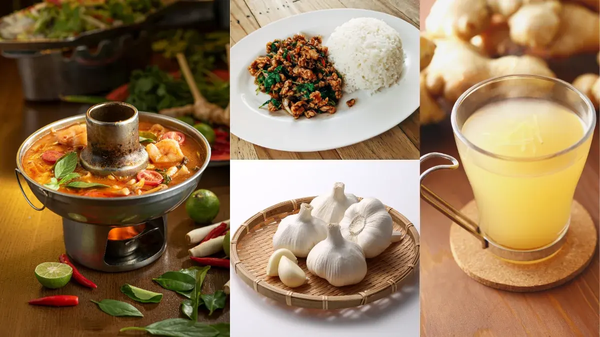 ผัก ผลไม้ที่แนะนำ : ขิง ข่า ตะไคร้ พริกไทย โหระพา ยี่หร่า กระเทียม กระเพรา