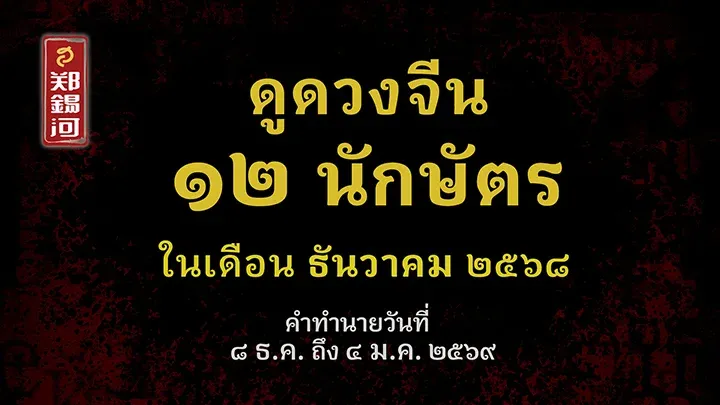 คำทำนาย พื้นดวงชะตา ของคนที่เกิดในแต่ละนักษัตร ทั้ง 12 ราศี ในเดือนธันวาคม 2568 ว่าพื้นดวงชะตาของแต่ละคนมี การเปลี่ยนแปลงทางด้านบวกหรือด้านลบ เรื่องใดโดดเด่น และ เรื่องใดต้องระมัดระวังปรับปรุงแก้ไข คำทำนายนี้มีผล ตั้งแต่วันที่ วันที่ 7ธันวาคม 2568 ถึงวันที่ 4 มกราคม 2569