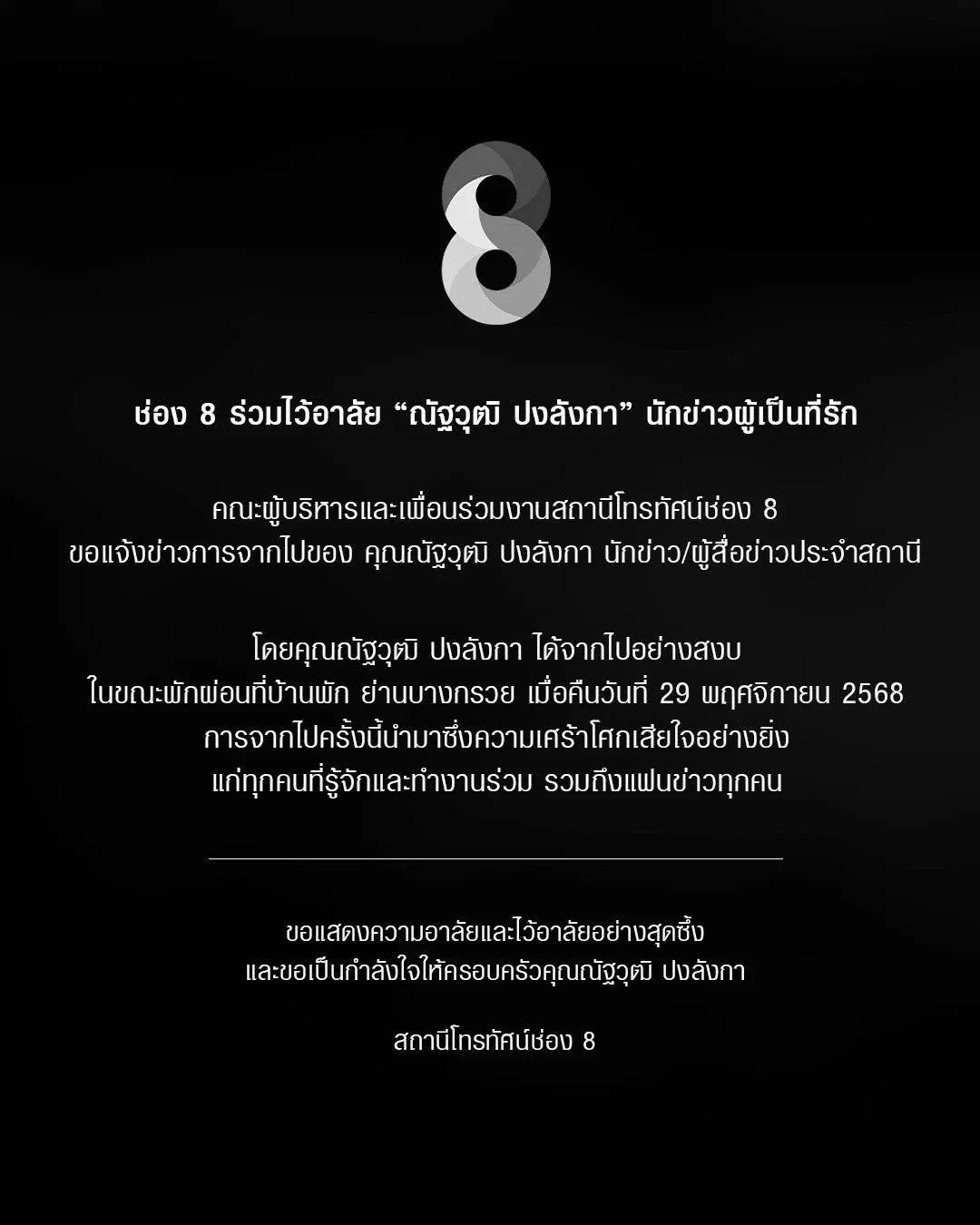 “ช่อง 8 ร่วมไว้อาลัย “ณัฐวุฒิ ปงลังกา” นักข่าวผู้เป็นที่รักคณะผู้บริหารและเพื่อนร่วมงานสถานีโทรทัศน์ช่อง 8 ขอแจ้งข่าวการจากไปของ คุณณัฐวุฒิ ปงลังกา นักข่าว/ผู้สื่อข่าวประจำสถานี