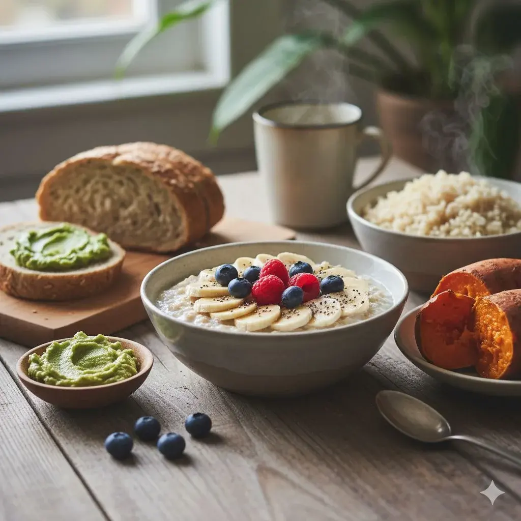 • ตัวอย่างเมนู: ข้าวโอ๊ต, ขนมปังโฮลวีท, ข้าวกล้อง, มันหวาน