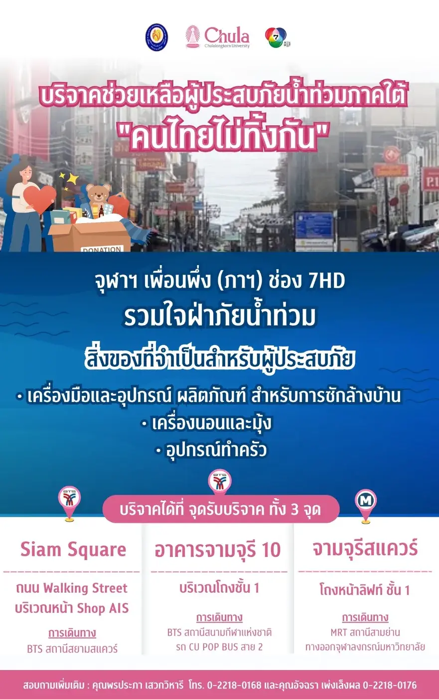 จุฬาฯ • เพื่อนพึ่ง (ภาฯ) • ช่อง 7HD รวมใจ ฝ่าภัยน้ำท่วมใต้ เปิดรับบริจาค 3 จุด