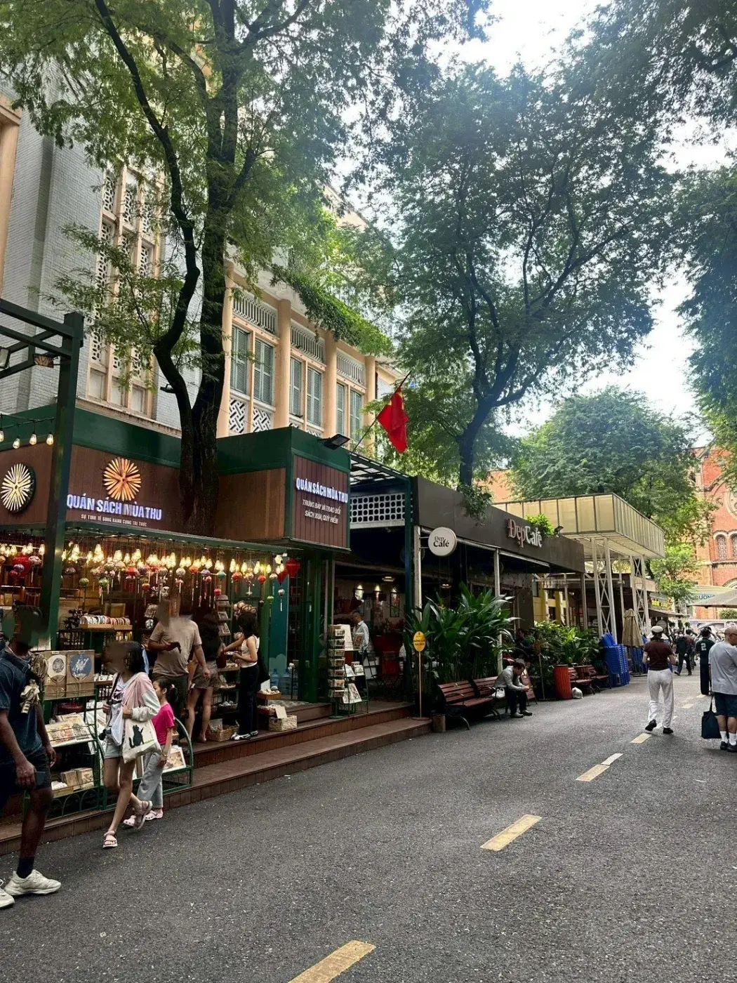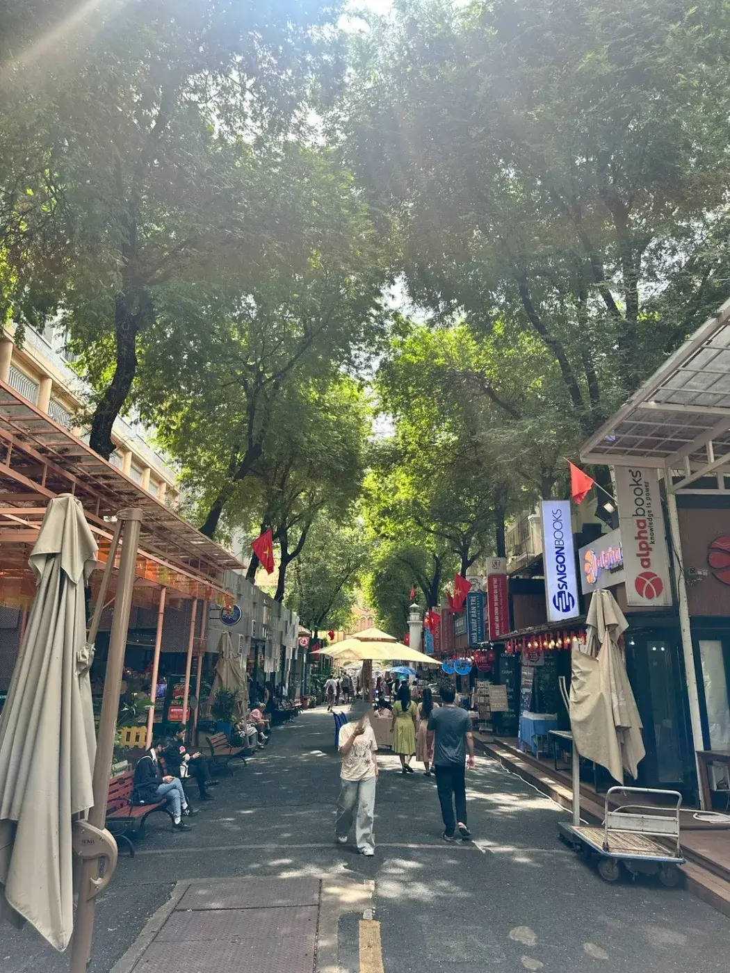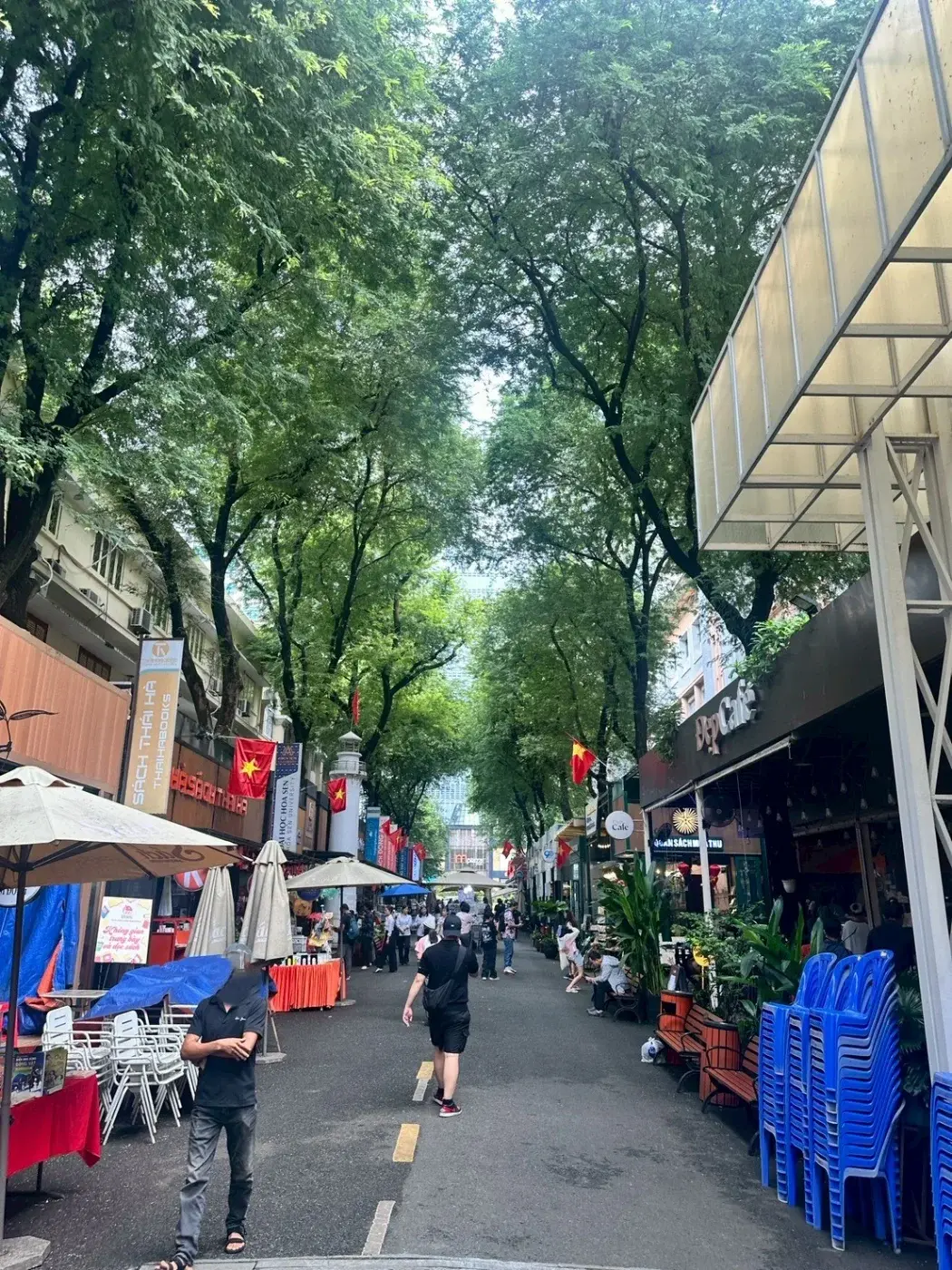ถนนหนังสือโฮจิมินห์ มีบรรยากาศที่ร่มรื่น มีมุมให้เพื่อนๆ ได้นั่งพักผ่อน อ่านหนังสือ หรือเพื่อนๆ จะเลือกรับประทานอาหารหรือเครื่องดื่มเย็นๆ ที่ร้านอาหารบรรยากาศสบายๆ เพื่อเติมพลังก่อนไปเดินเลือกซื้อหนังสือต่อก็ได้น๊ะ