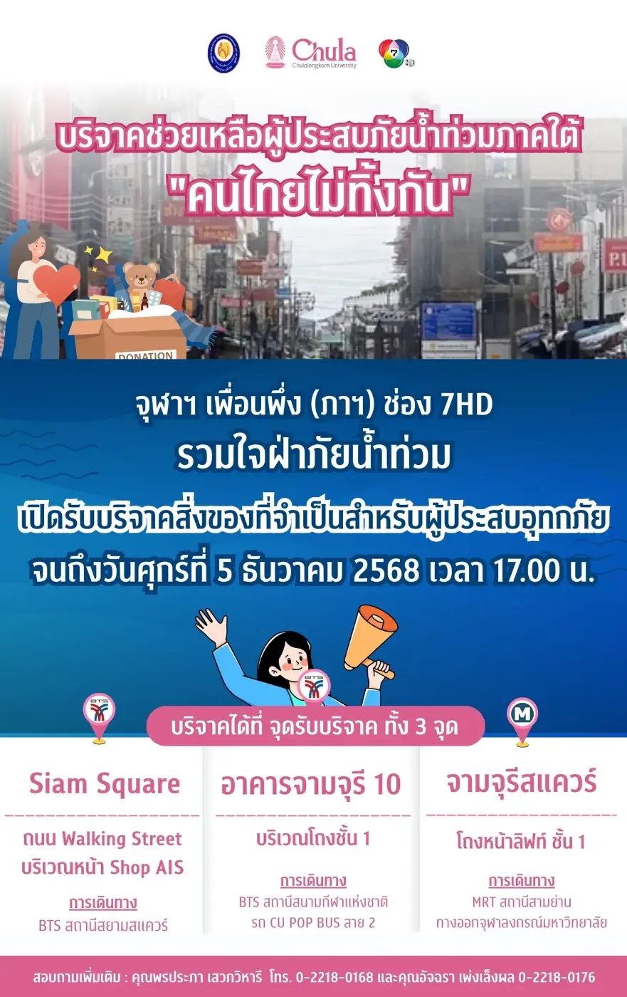 จุฬาฯ + เพื่อนพึ่ง (ภาฯ) + ช่อง 7HD รวมใจ เปิดรับบริจาคสิ่งของที่จำเป็นสำหรับผู้ประสบอุทกภัย