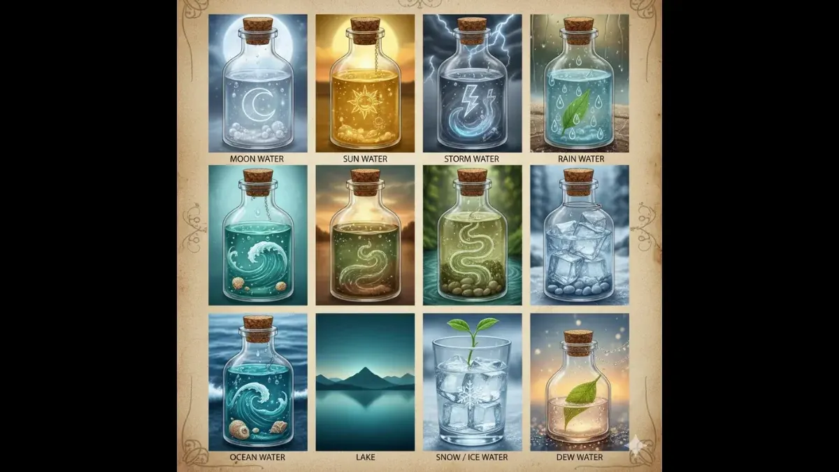 น้ำแต่ละชนิดมีคุณสมบัติเฉพาะตัวที่สามารถนำมาใช้เพื่อวัตถุประสงค์ทางจิตวิญญาณและการเสริมสร้างความตั้งใจได้ ดังนี้