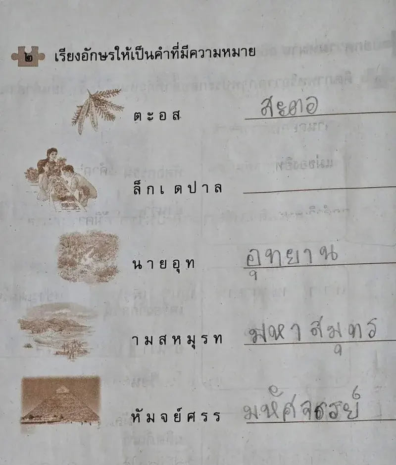 ข่าวนี้มาจากเฟซบุ๊ก สื่อการสอนภาษาไทย By ครูแพร เป็นภาพการบ้านของเด็กนักเรียนวิชาภาษาไทย โจทย์ให้ เรียงตัวอักษรที่กำหนดให้เป็นคำที่มีความหมาย