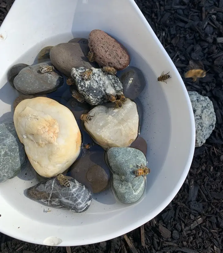 6. ฉันเห็นว่าทุกครั้งที่ฉันรดน้ำต้นไม้ จะมีผึ้งมากินน้ำที่พื้น ดังนั้นฉันจึงทำอ่างน้ำจากชามและใส่ก้อนหินให้พวกมัน