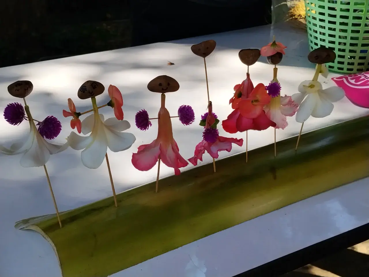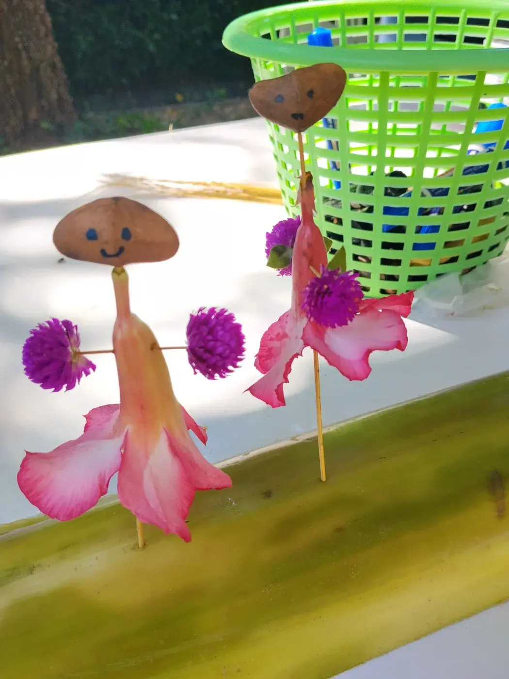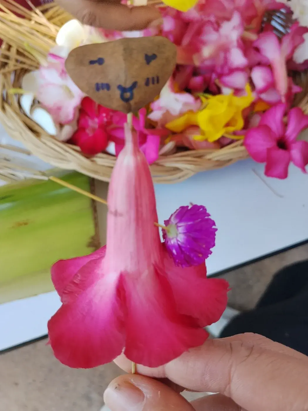 นี่เป็นเจ้าตุ๊กตาของเด็กห้าขวบที่ทำ แขนทั้งสองข้างนั้นทำจากไม้จิ้มฟันกระโปรงนั้นทำจากดอกชวนชม ที่กำลังบานสวยงามกลายเป็นกระโปรง กำลังเต้นระยำอย่างมีความสุขและสนุกกับงาน