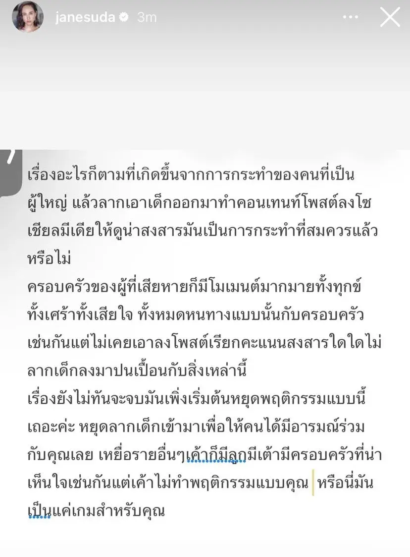 ประเด็นเดือดจนไฟลุกจริง ๆ มาจากสตอรี่ของ เจนสุดา ที่ฟาดจัดเต็มแบบไม่อ้อมค้อมสักคำ