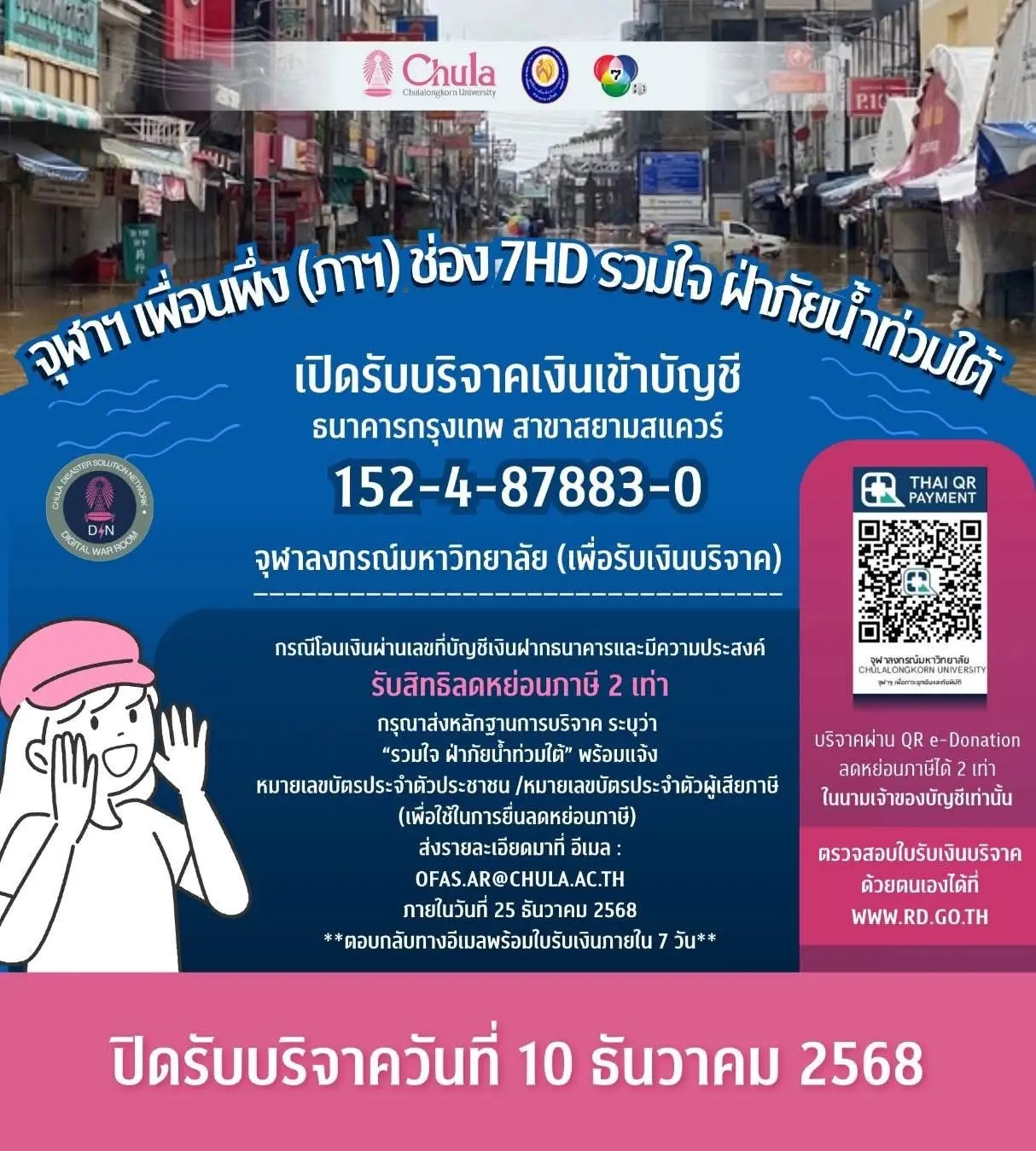 จุฬา ร่วมกับ เพื่อนพึ่ง (ภาฯ) และช่อง7 เปิดรับบริจาคช่วยภัยน้ำท่วมใต้
