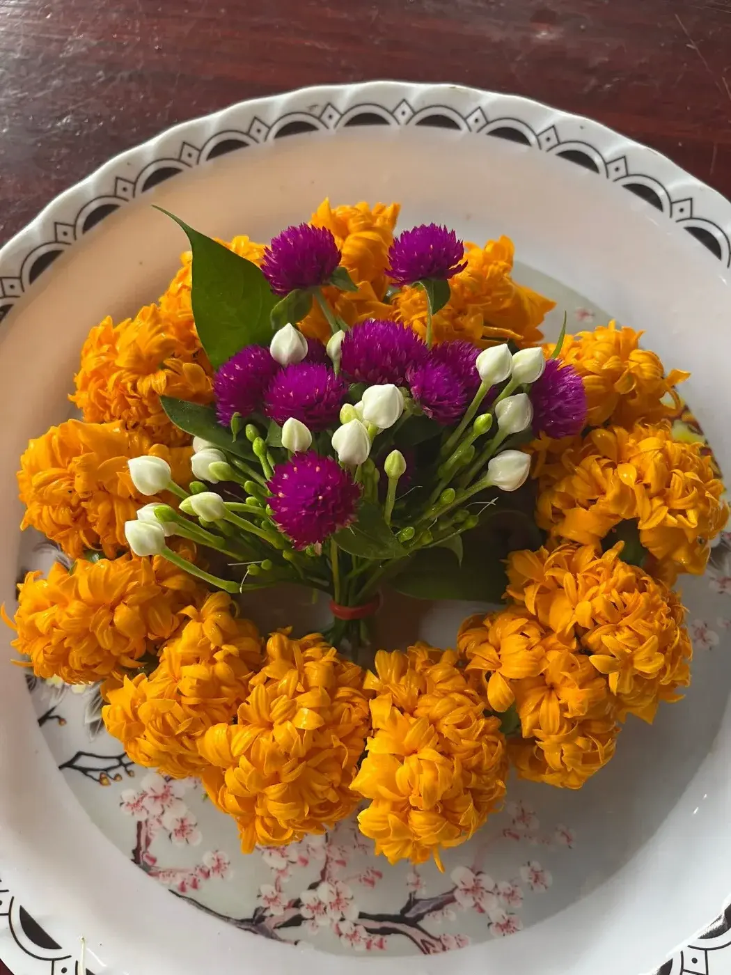การนำในส่วนของพวงมาลัยนั้นไปถวาย ในพวงมาลัย จากนั้นก็จะนำมาช่วย ผูกในส่วยของฝ้ายผูกิฝ้ายที่ใช้ผูกนั้นเรียกว่าฝ้ายดิบ สีขาวใหญ่ สมัยที่นายนั้นยังอยู่ยายนั้นจะยังคงทำเองในส่วนของฝ้ายให้ความมั่นคงและมีความตั้งมั่น นั่นแสดงว่าความสุขนั้นล้ำค่า มาดกว่าสิ่งที่หลงเหลือไว้