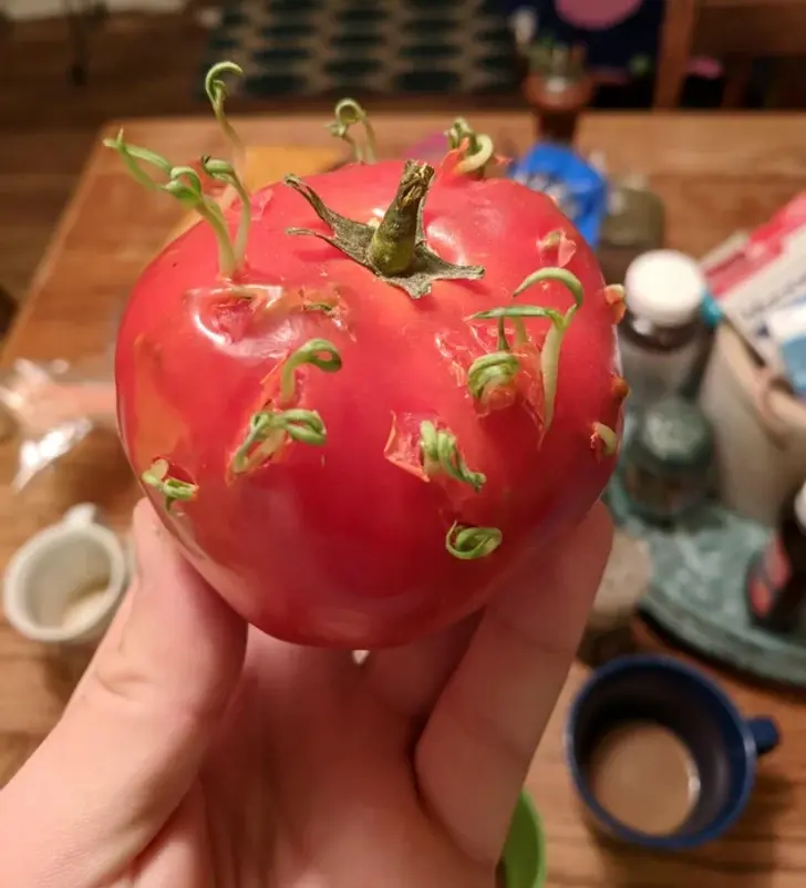 8. ต้นอ่อนมะเขือเทศที่เริ่มงอกออกมาจากเมล็ดด้านในของผลมะเขือเทศ
