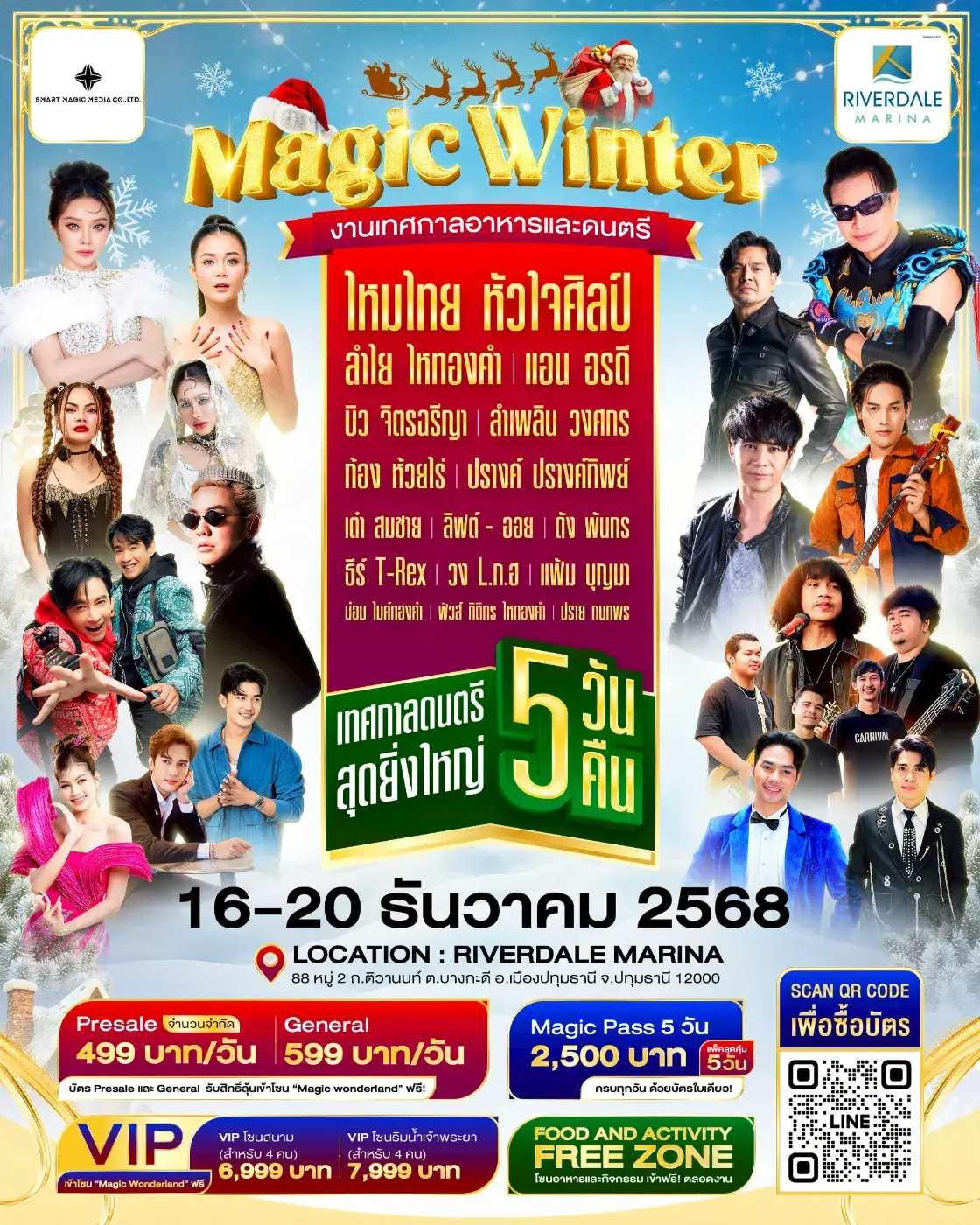 ปทุมธานีเตรียมลุกเป็นไฟ! เปลี่ยนบรรยากาศความหนาวเย็นมารับไออุ่นกันทั้งครอบครัว เพราะงาน MAGIC WINTER เทศกาลอาหารและดนตรีสุดอลังการกลับมาเขย่าวงการให้สั่นสะท้านอีกครั้ง ระหว่างวันที่ 16–20 ธันวาคม 2568 ณ ริเวอร์เดล มาริน่า ปทุมธานี ที่ปีนี้บอกเลยว่า ยิ่งใหญ่กว่า สนุกกว่า และฟินกว่าเดิมไม่มีแผ่ว! บ่มียั้ง เด้อพ่อเด้อแม่!