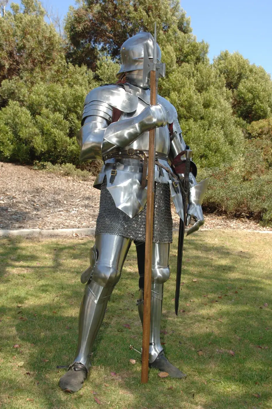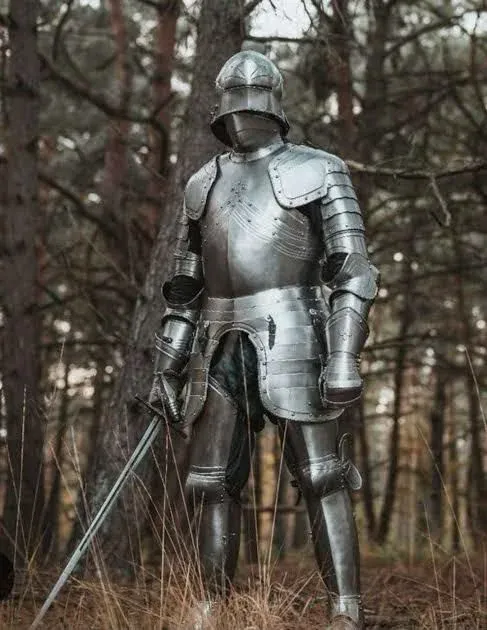 แต่คนโบราณนี่เก่งจริงนะ พวกเขาไม่หยุดพัฒนา ช่วงศตวรรษที่ 13 ก็เริ่มมีการเพิ่ม “แผ่นเหล็ก” เข้ามาป้องกันตามส่วนต่าง ๆ ของร่างกาย จนถึงปลายศตวรรษที่ 14 เกราะแบบแผ่นก็กลายเป็นตัวเอกของชุดอัศวินแล้ว กลายเป็นภาพจำที่เราคุ้นเคย—เหล็กทั้งตัวตั้งแต่หัวจรดเท้า แต่ข้างในยังมีเกราะโซ่อยู่ด้วยนะ ไม่ใช่แค่แผ่นเหล็กเปล่า ๆ