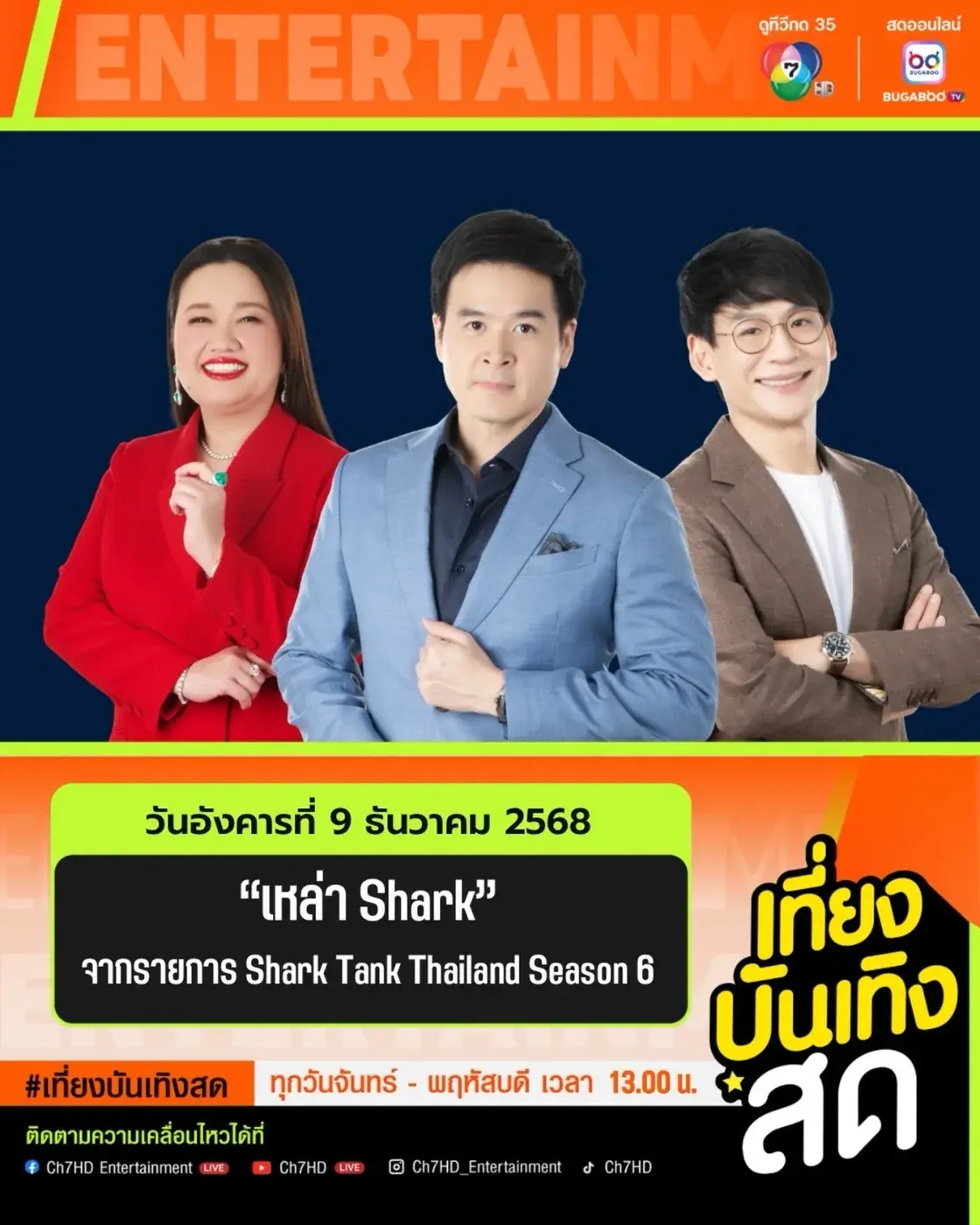 #เที่ยงบันเทิงสด วันนี้พบกับ เหล่า Shark จาก รายการ SHARK TANK THAILAND SEASON 6 ชาร์คหมู ชาร์คตุ๊ก และชาร์คเบนซ์ เหล่าชาร์คนักลงทุนมากันขนาดนี้จะพลาดได้ยังไง เจอกันเวลา 13.00 น.