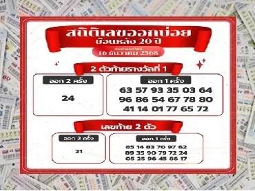 เผยสถิติเลขออกบ่อย ย้อนหลัง 20 ปี..งวดวันที่ 16 ธันวาคม 68 เหลือเวลาอีกไม่นานก็ถึงวันแห่งความหวังแล้ว เชื่อว่าหลายคนอาจจะยังไม่มีสลากกินแบ่งรัฐบาล วันนี้เราเลยรวบรวมเอาข้อมูลหวยตลอด 20 ปีที่ผ่านมา ว่าในวันที่ 16 ธันวาคม นั้นหวยจะออกเลขอะไรบ่อยที่สุด ทั้งนี้ก็เพื่อใช้เป็นแนวทางในการเสี่ยงโชคหวยงวดนี้ มีหลายคนที่เคยซื้อตามแล้วถูกหวยก็ยังมี สถิติดีๆ แบบนี้เสียดายแย่ถ้าไม่ลองซื้อตาม