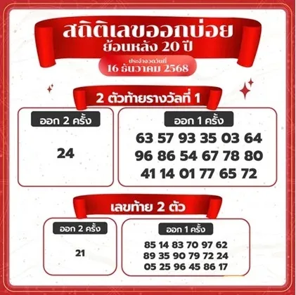 เผยสถิติเลขออกบ่อย ย้อนหลัง 20 ปี..งวดวันที่ 16 ธันวาคม 68