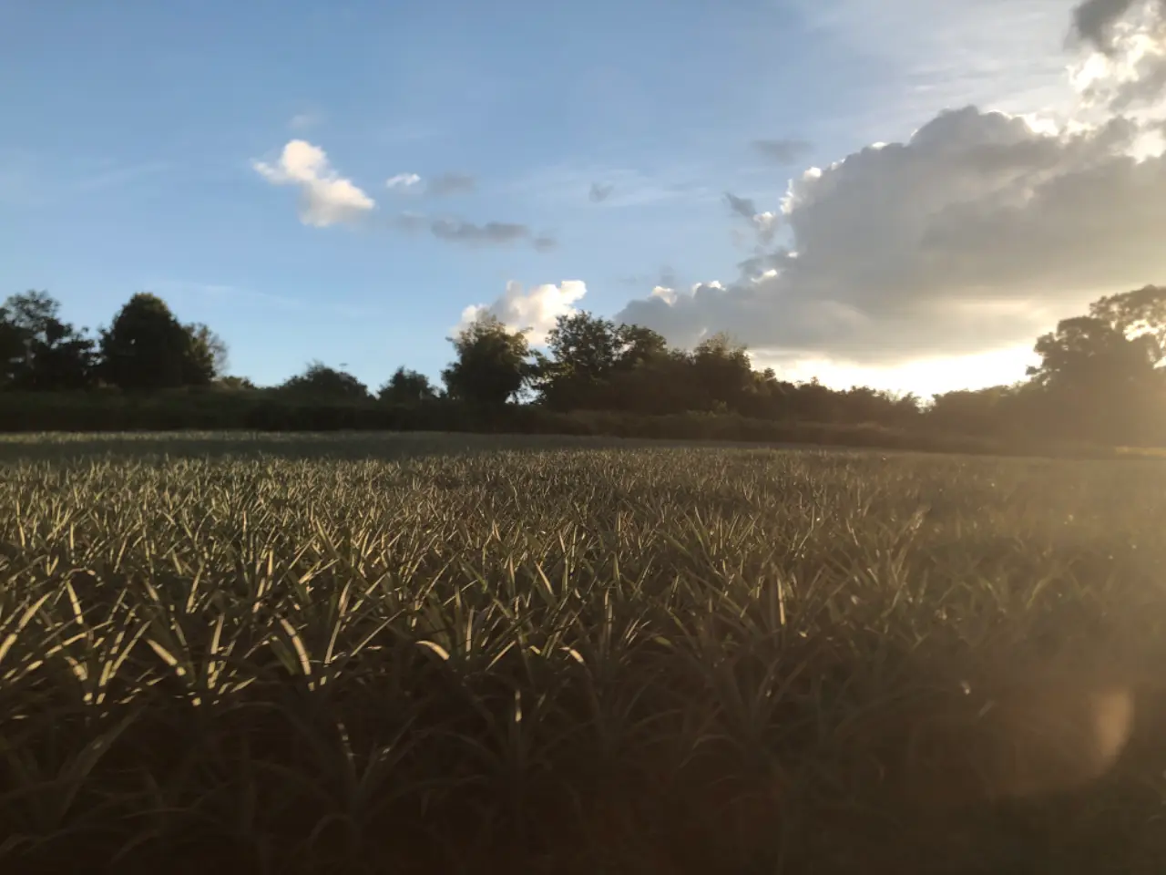 สวนสับปะรดมากกว่าร้อยไร่ ที่มีต้นไม้รายรอบ สวนสับปะรดที่เรานั้นมองไปคือสับปะรดนั้นมีจำนวนมาก หลากหลายต้นเป็นหมื่นต้น ตรงกลางนั้นจะเห็นลูกและผลของสับปะรดนั้นพากันออกดอกมาจำนวนมากหลากหลายชนิด