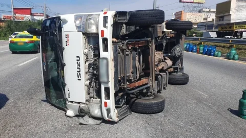 รถบรรทุกก๊าซพลิกคว่ำ ถังก๊าซกระจายเกลื่อนถนน เจ้าหน้าที่เร่งเคลียร์พื้นที่เพื่อป้องกันโศกนาฏกรรม.
