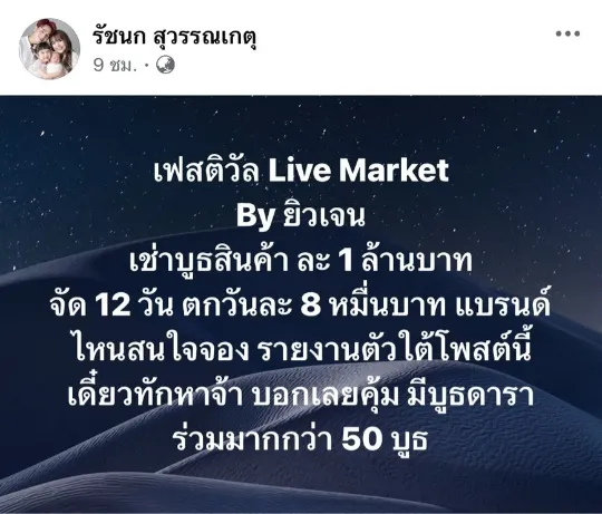 เทศกาลเจนนี่ มาไว ไปไว หลังจากที่ดาราจองคิวไลฟ์ขายผลิตภัณฑ์ตัวเองกันทั้งวัน มียอดขายสูงถึง 123 ล้านบาทในวันเดียว จน 2 สามี ภรรยา มีโปรเจค Live Market Festival ที่ให้เช่าบูธ ๆ ละ 1 ล้านบาท