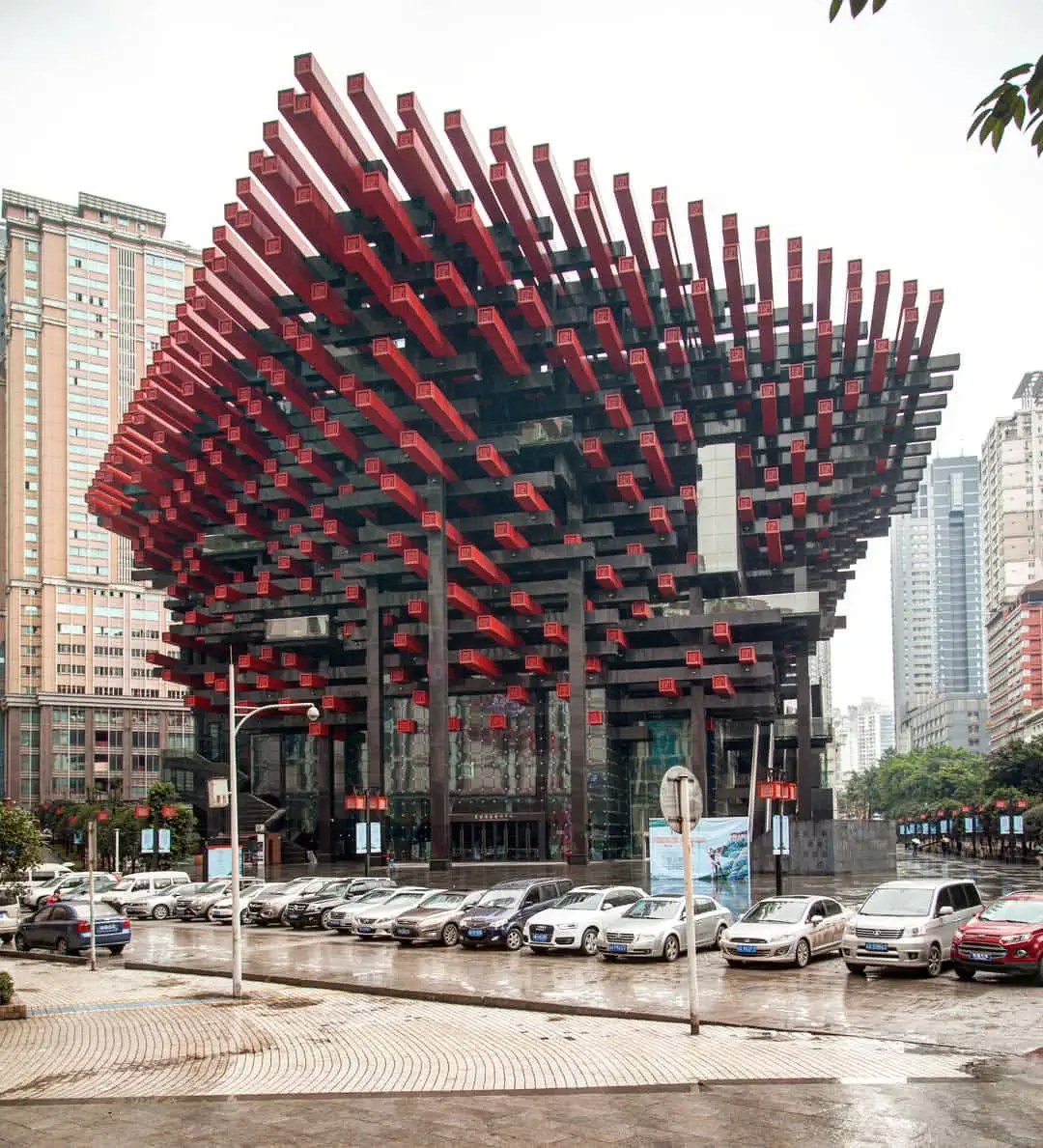 เวลาแสงตกกระทบสีดำแดงของตึกในช่วงเย็น มันยิ่งให้ความรู้สึกเหมือนกองตะเกียบกำลังเรืองสว่างแทรกอยู่กลางเมืองที่ไม่เคยหลับใหล ทำให้ตึกนี้ไม่ใช่แค่สถาปัตยกรรม แต่กลายเป็นแบรนด์ประจำเมืองฉงชิ่งไปโดยปริยาย
