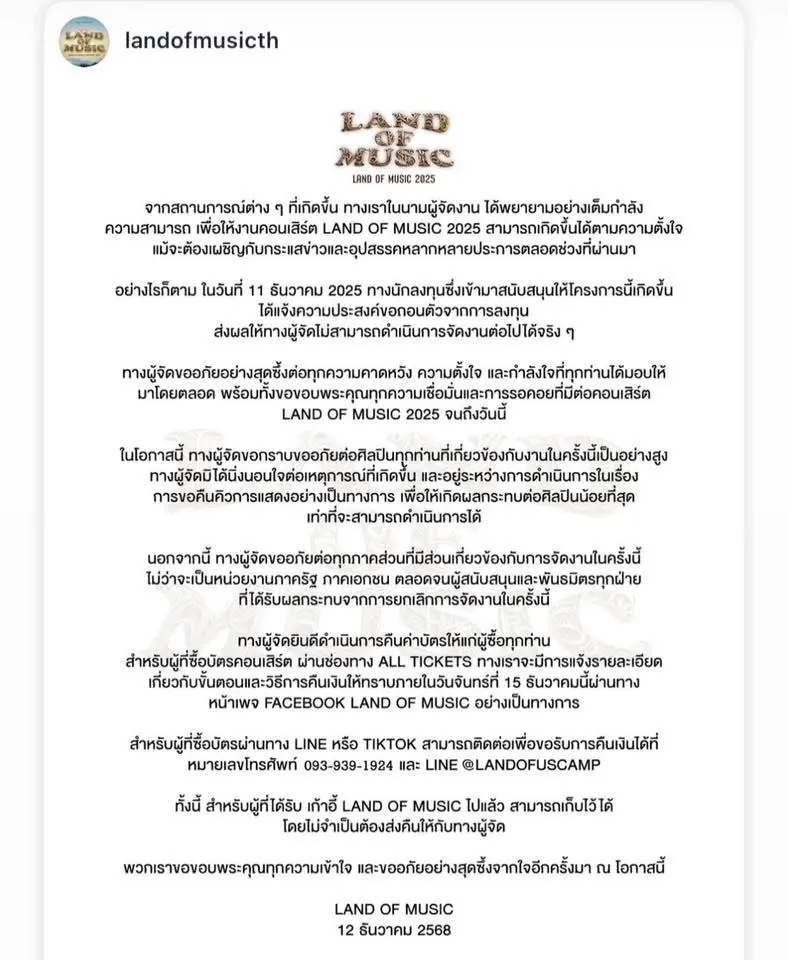 💢เอ้า!! ยกเลิกคอนเสิร์ตหรา!!! - ทางนักล ง ทุ น ซึ่งเข้ามาสนับสนุนให้โครงการนี้ ได้แจ้งความประสงค์ขอถอนตัวจากการล ง ทุ น ส่งผลให้ทางผู้จัดไม่สามารถดำเนินการจัดงานต่อไปได้จริง ๆ🫥