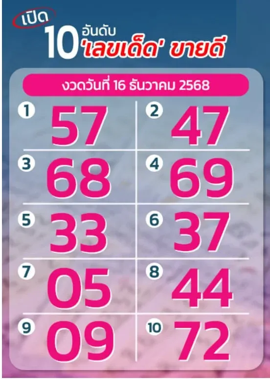 มาแล้ว! เปิด 10 อันดับเลขเด็ดขายดี งวดวันที่ 16 ธันวาคม 68..ส่องเลย พรุ่งนี้รวย!!